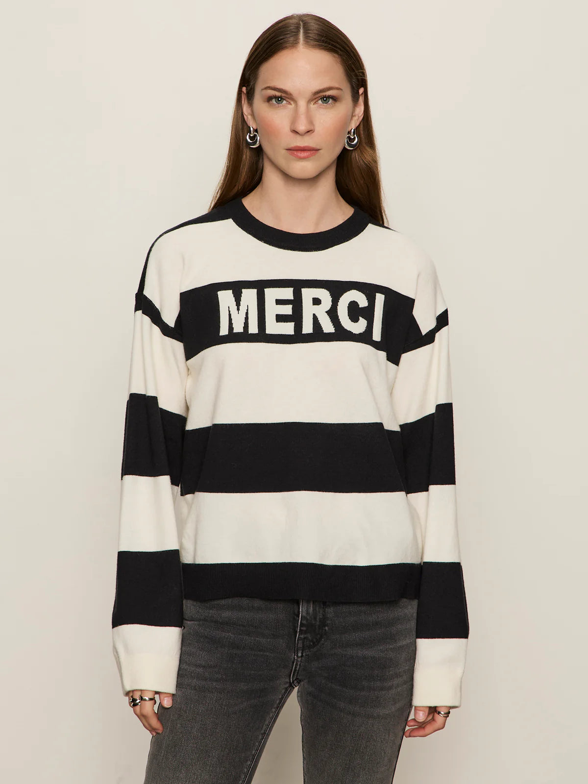 Classic Fit Popover Sweater  "MERCI" On Front Ribbed Cuff Crew Neck  Lightweight Relaxed Fit Model is 5'9 wearing size S. Front: 24" Bust: 42" Sleeve: 31 1/2"