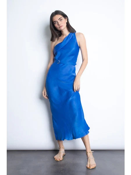 Indulge in luxury with our ANGELIQUE MIDI DRESS. Designed with a sophisticated one-shoulder silhouette, this blue dress is crafted from a silky material, giving you a sensual and elegant feel. Perfect for any occasion, this midi dress will make you feel like a true style icon.