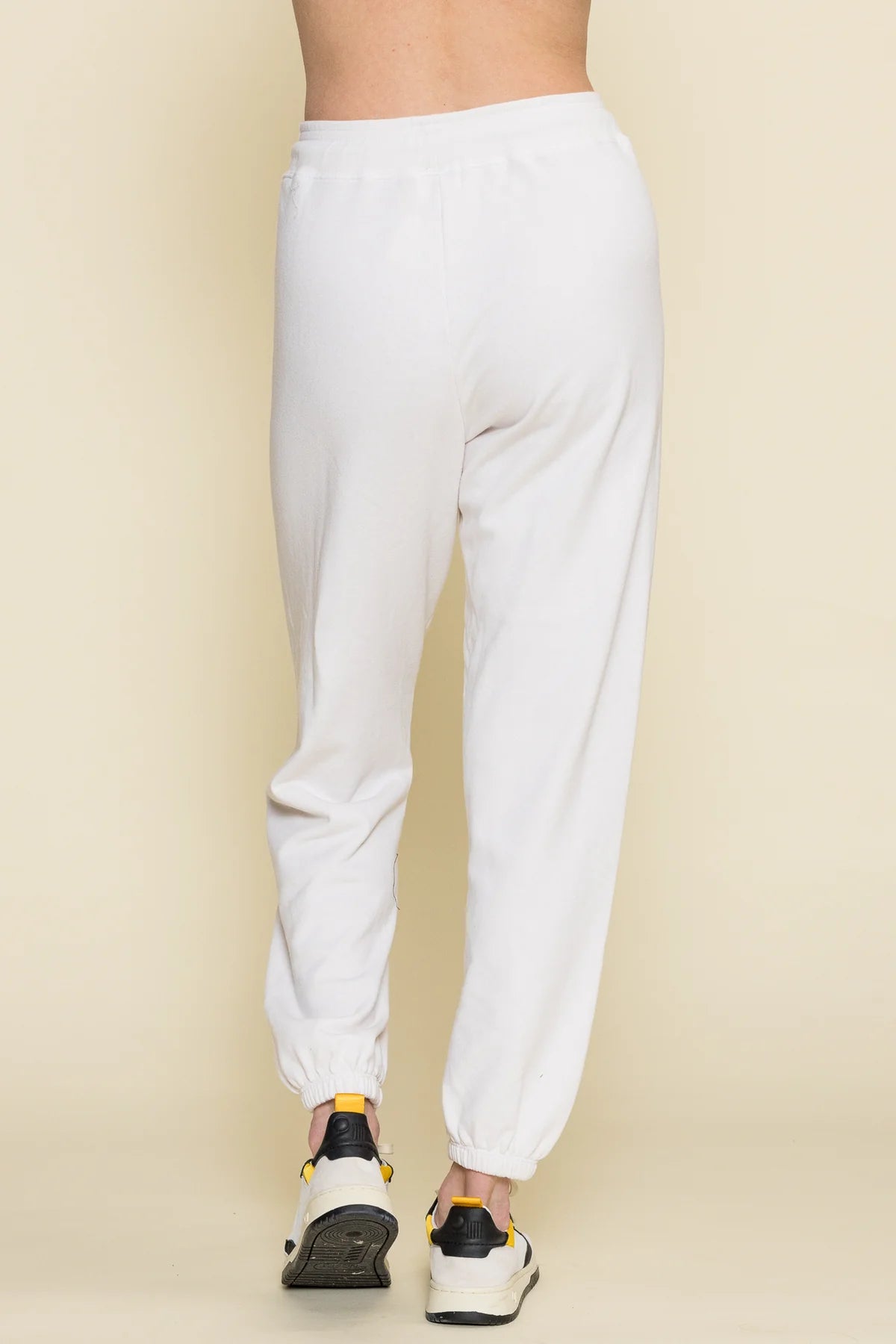These relaxed-fit trousers have a slightly slouchy silhouette. They feature a comfortable elastic waistband with bold braided drawstrings tipped in neon coral accents, adding a playful touch to the clean, minimalist design.