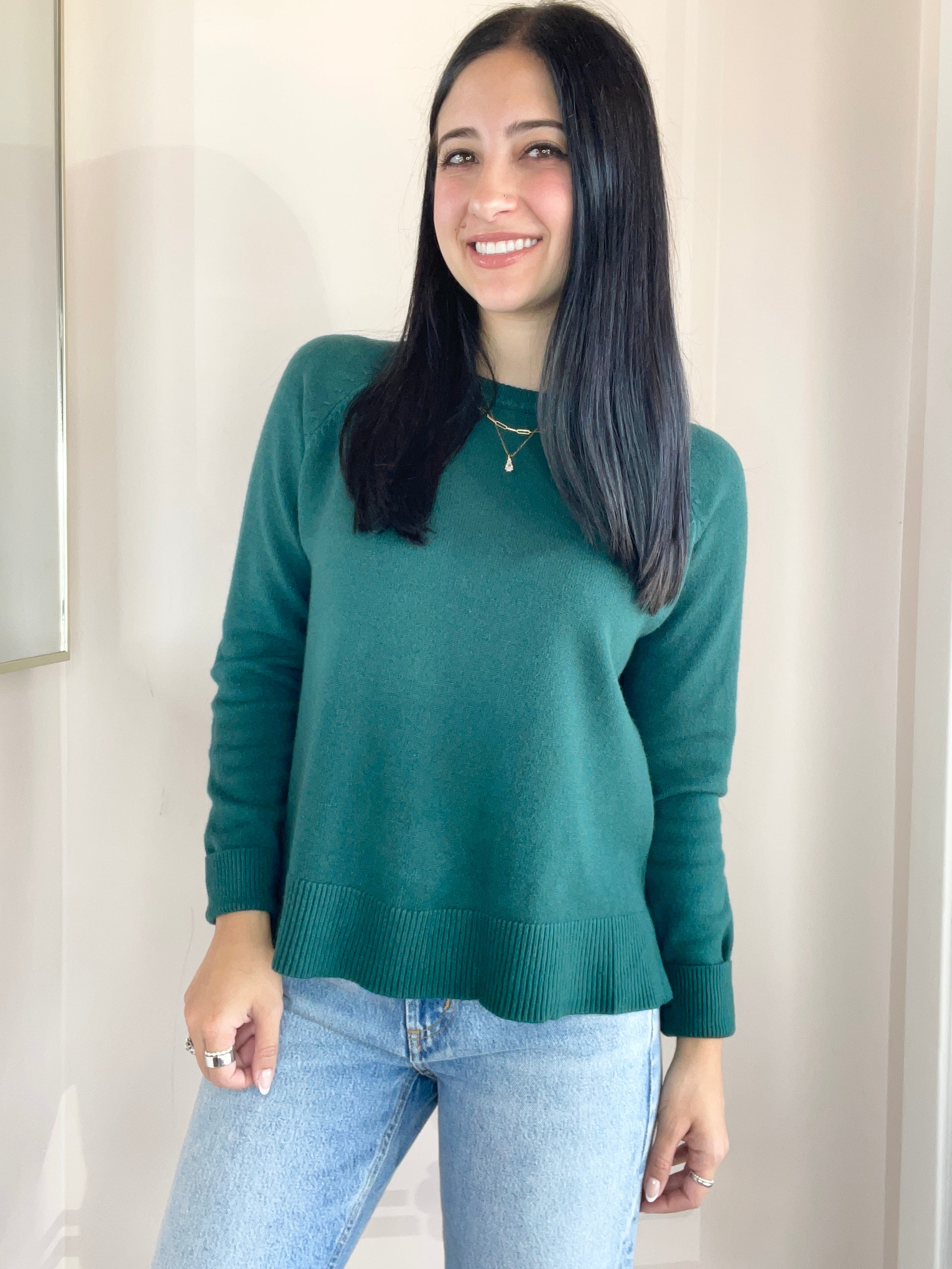 Viscose blend sweater with round neck and long raglan sleeves. Slits on the sides of the bottom cuff