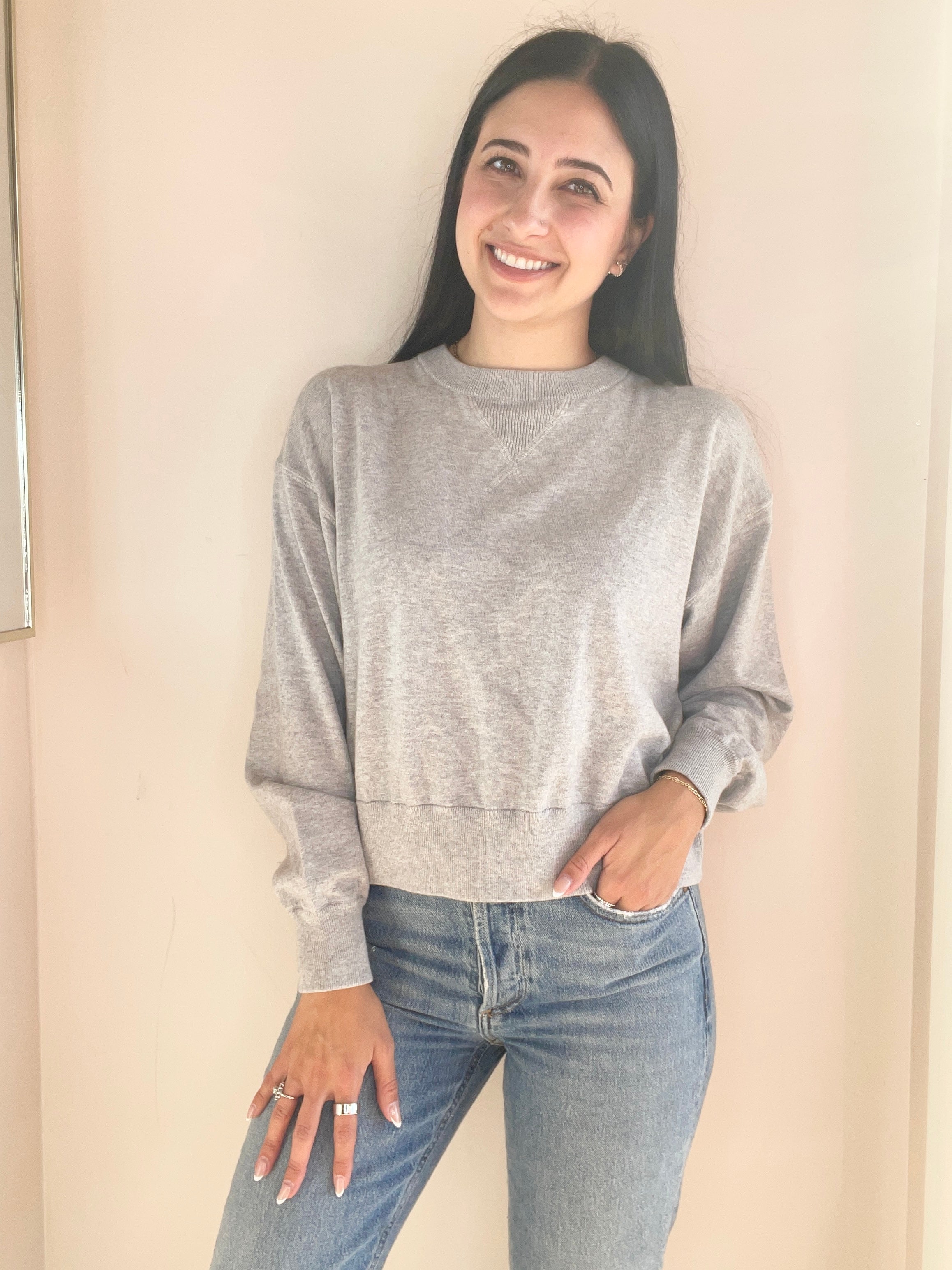 Grey boxy crew pullover. 95% cotton 5% cashmere. Gianna is wearing the XS - true to size.