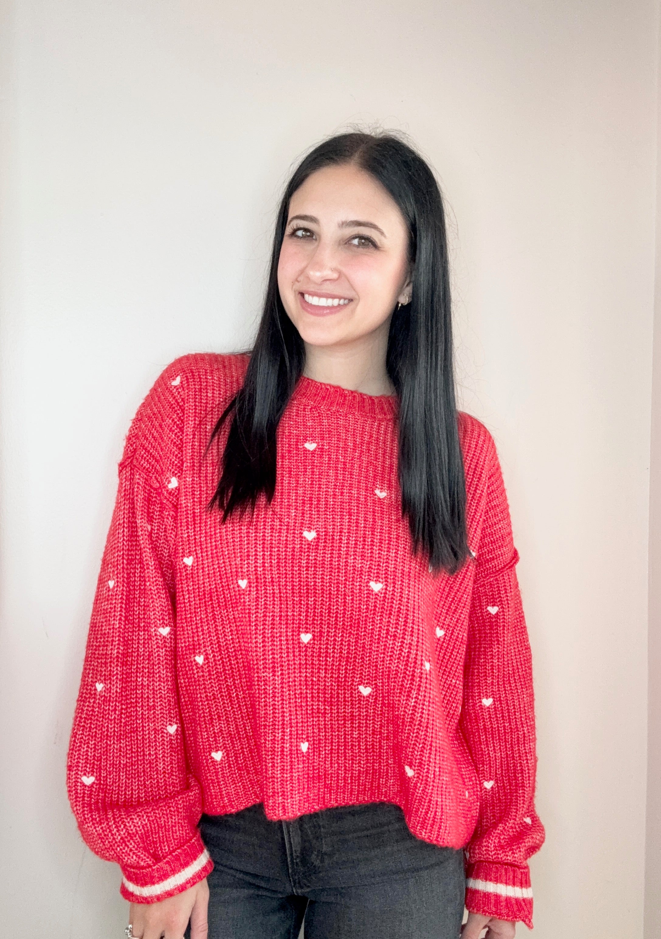The Charmer Sweater combines sweet charm with stylish sophistication, featuring a petite heart motif and twin white bands around each wrist.