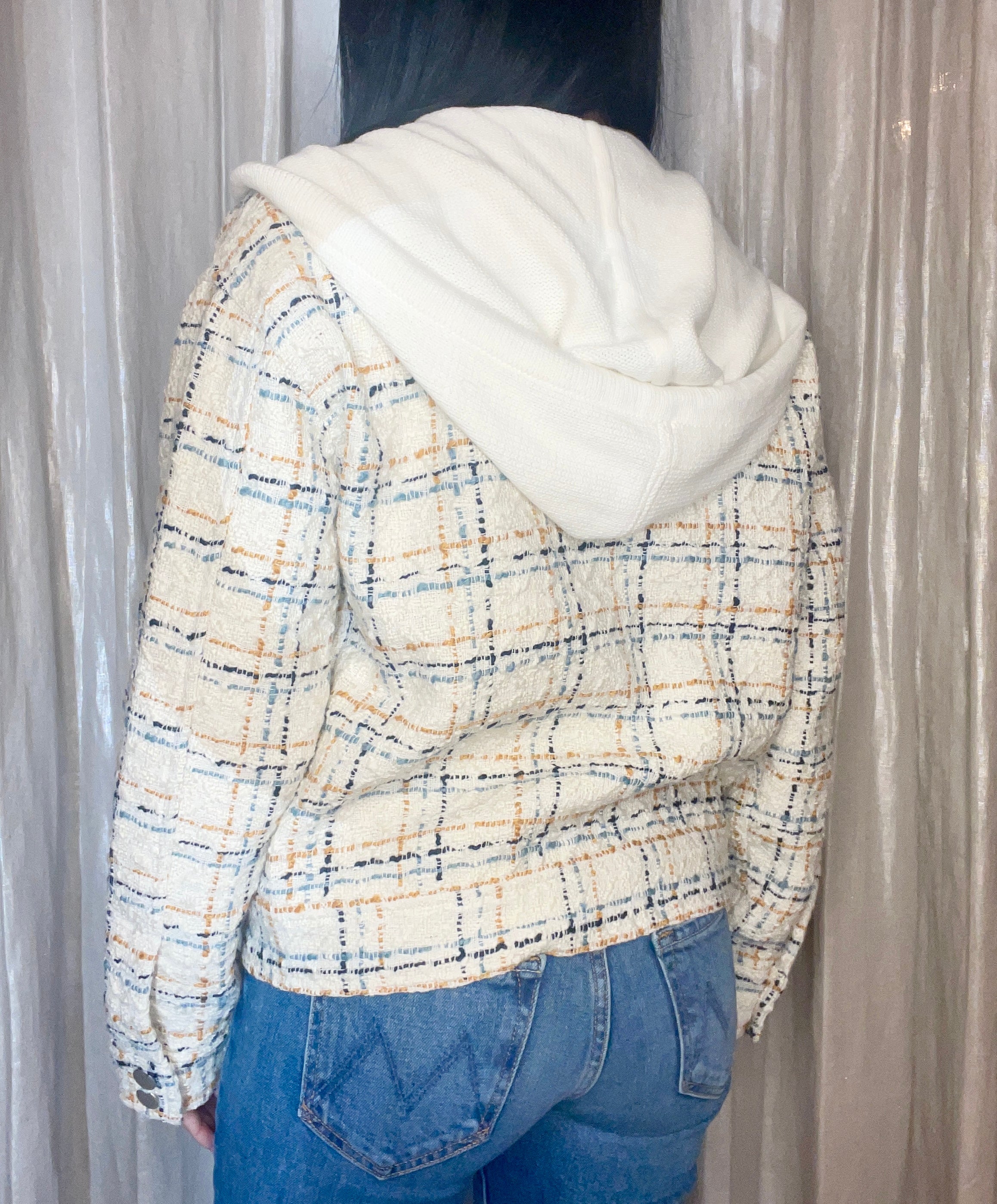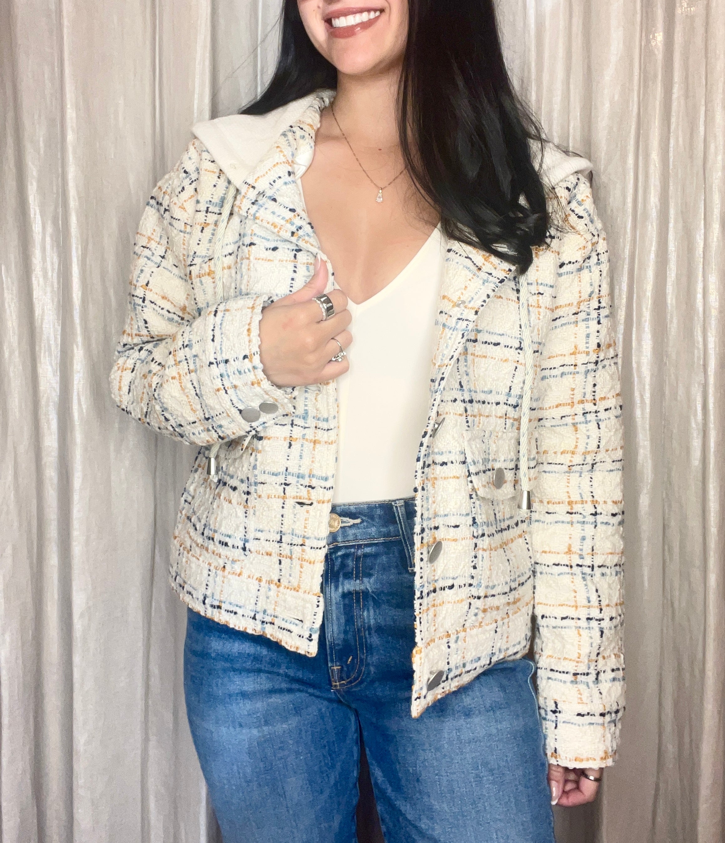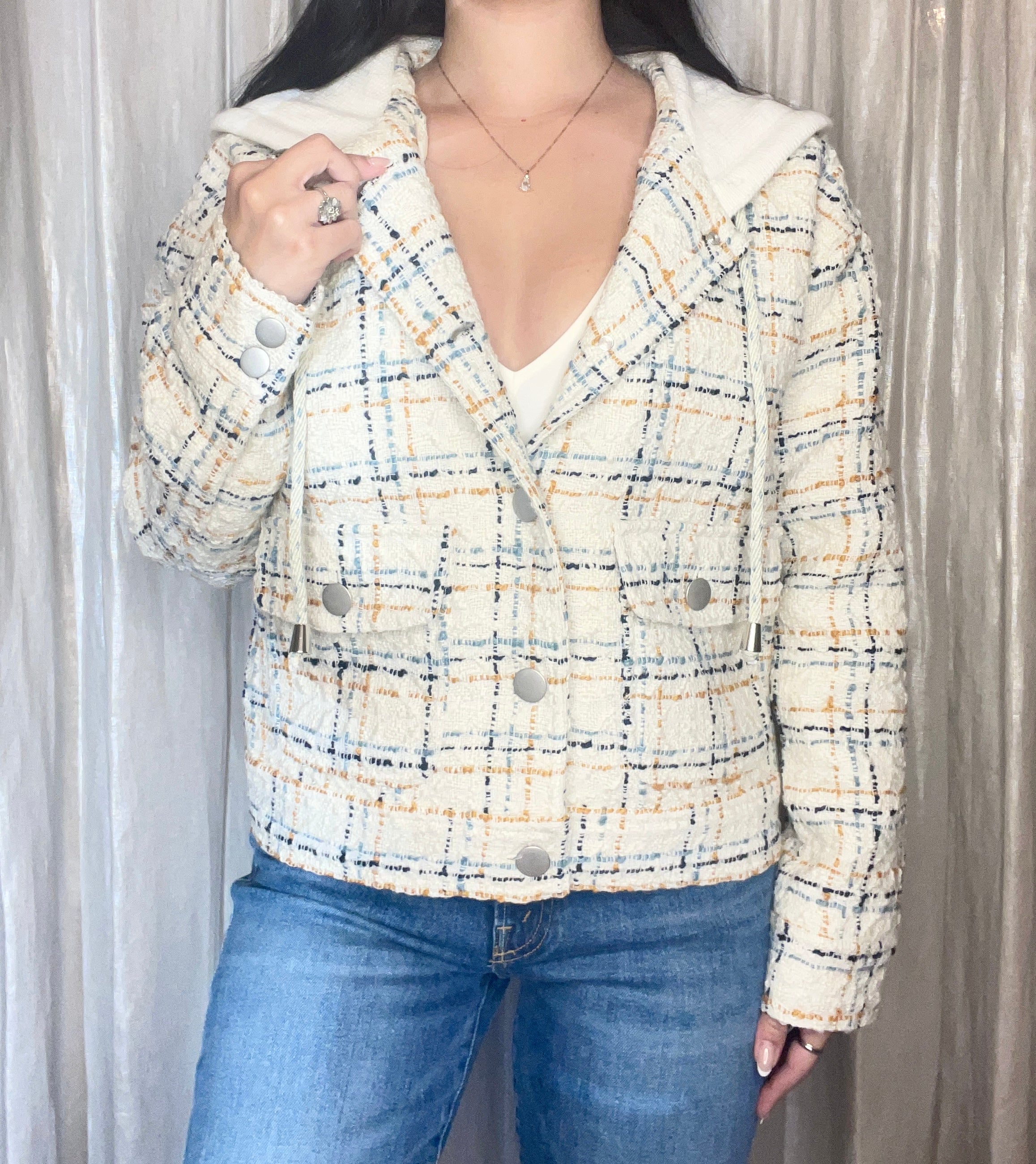 We love this tweed hooded jacket with fun silver hardware. True to size.