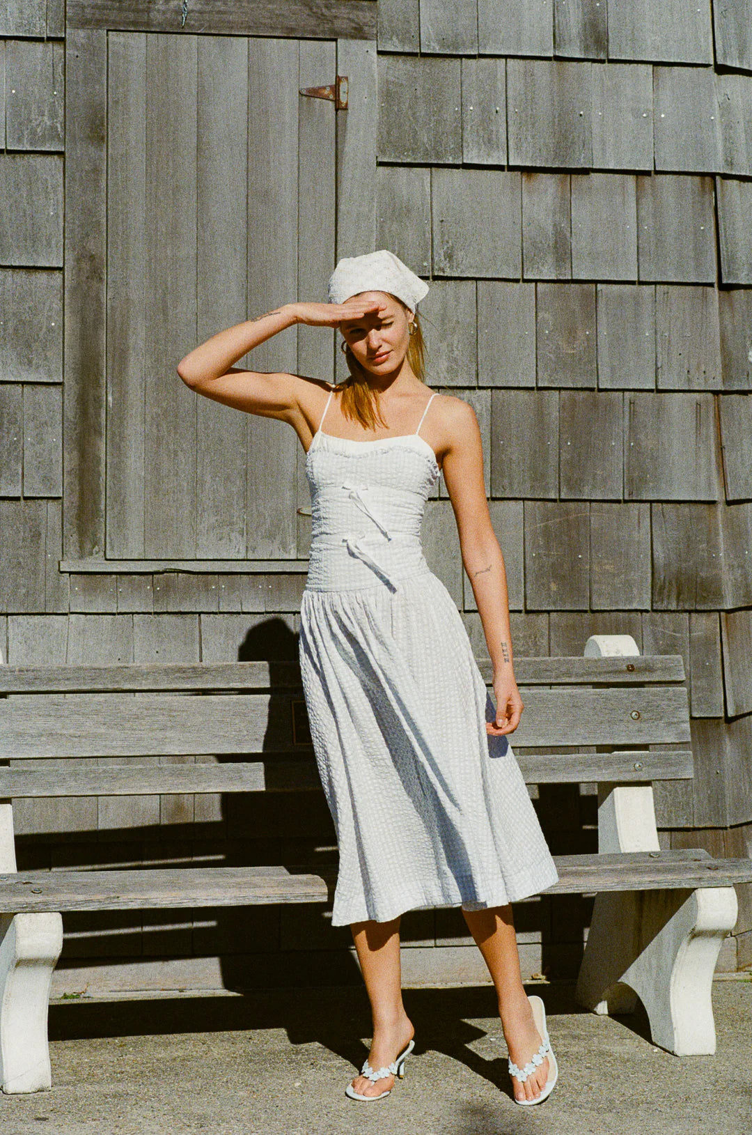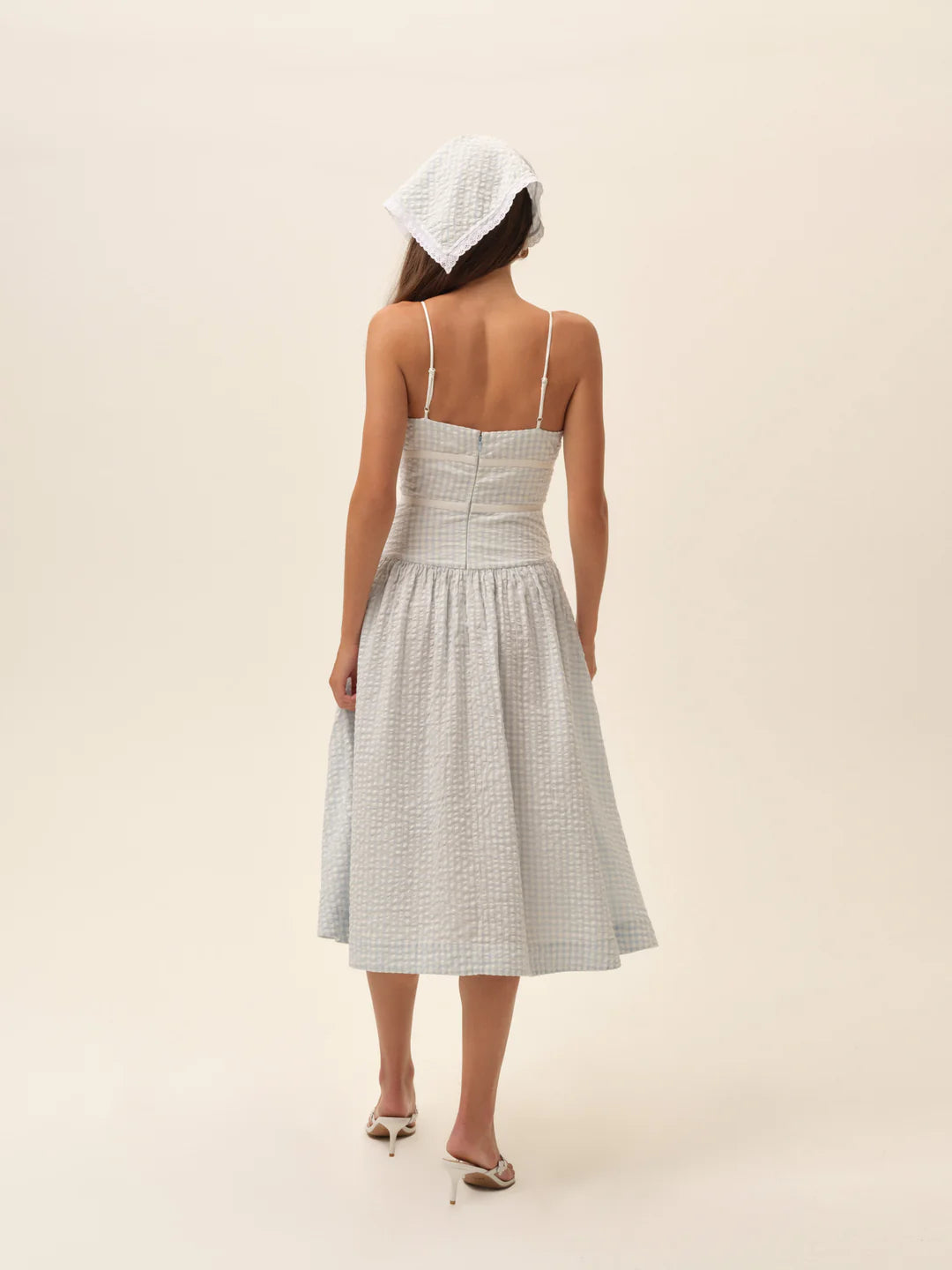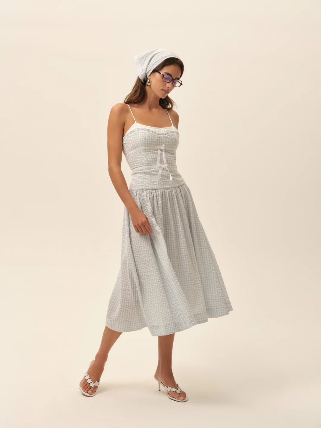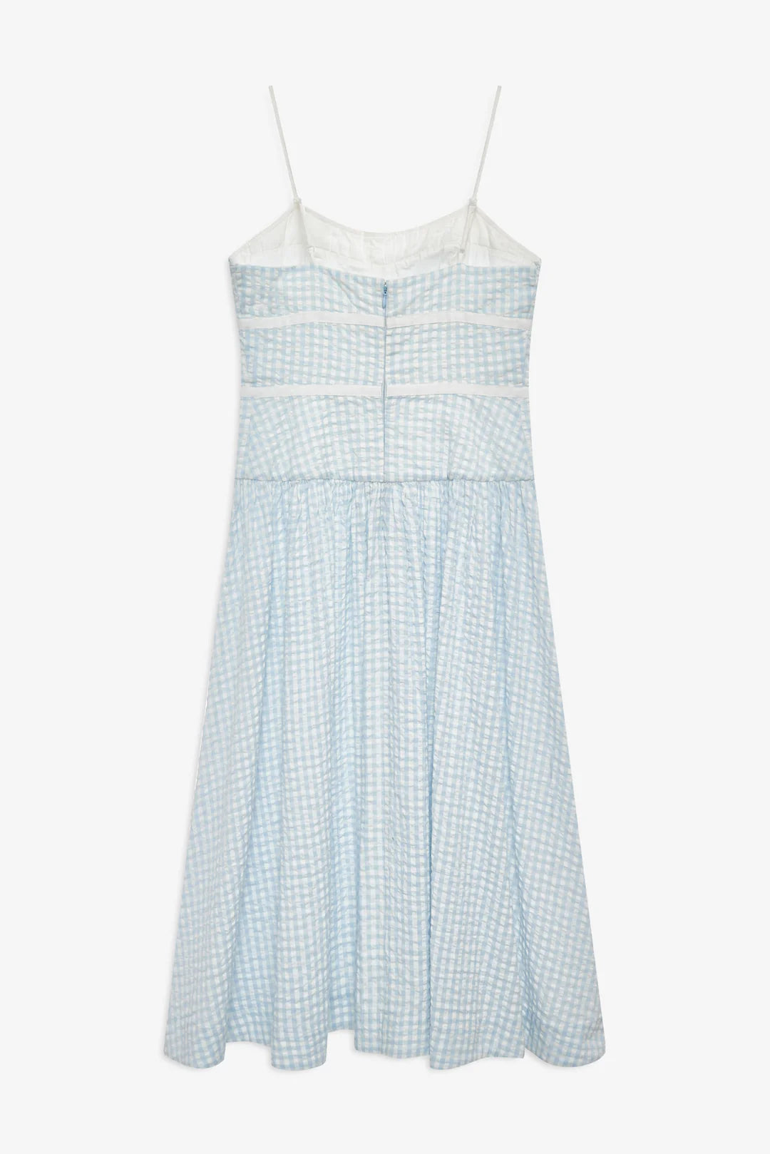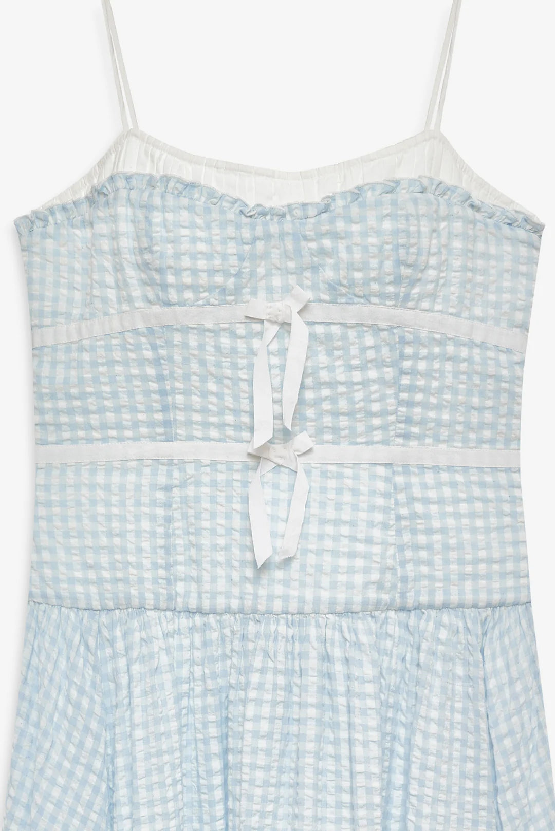 An elongating drop waist and dainty spaghetti straps give this blue gingham midi dress its feminine charm, finished with ribbon taping and bows that feel sweet yet sophisticated.