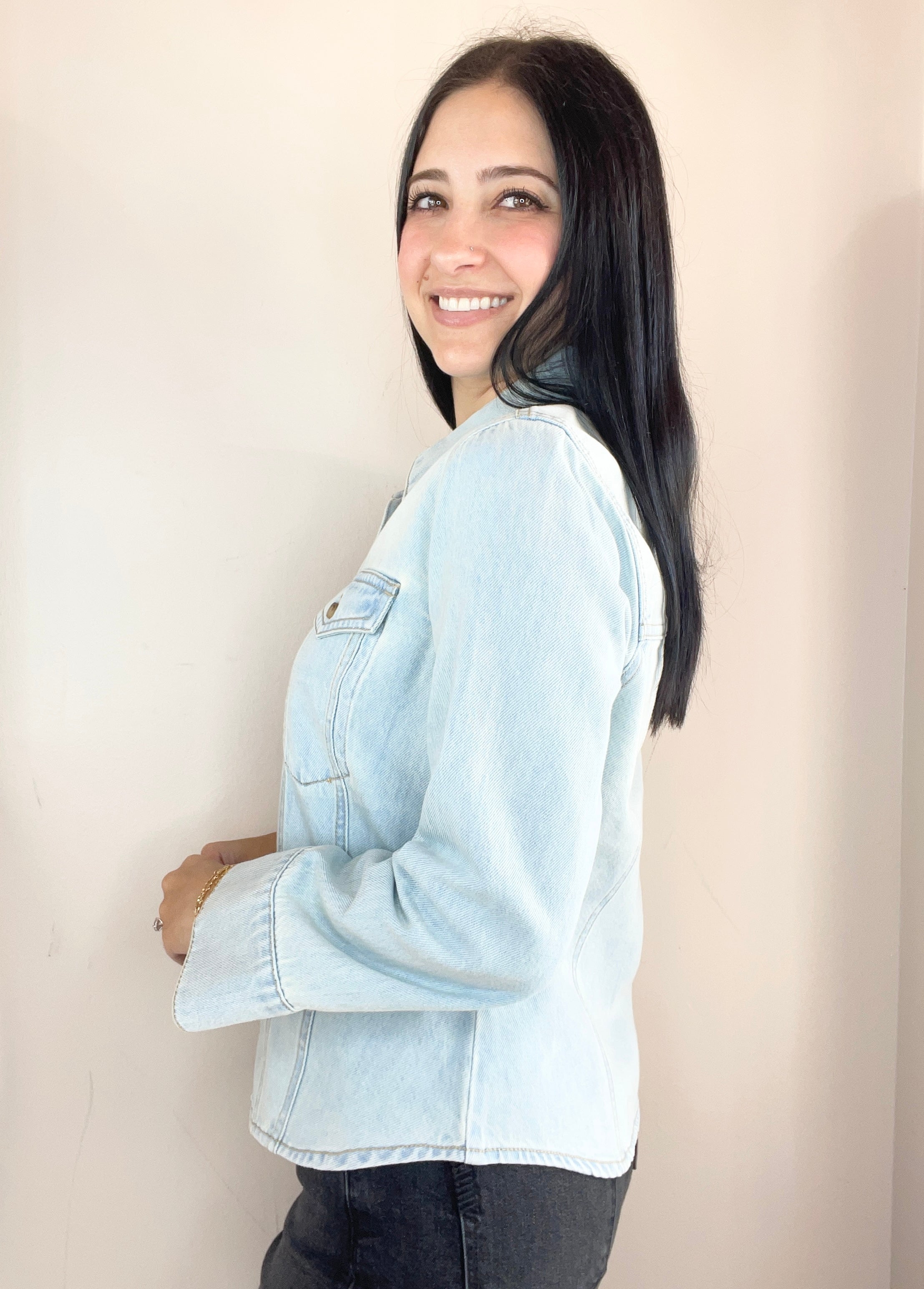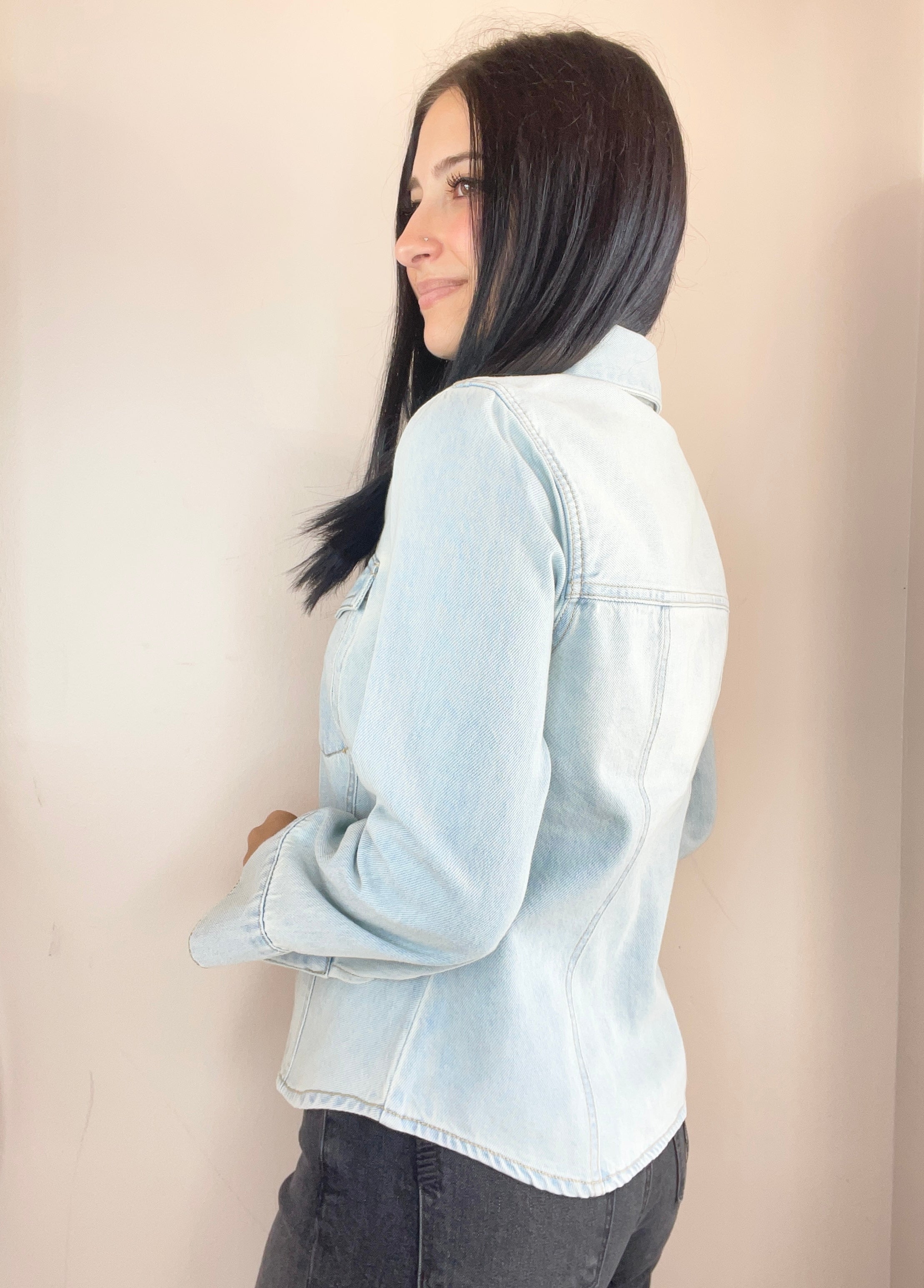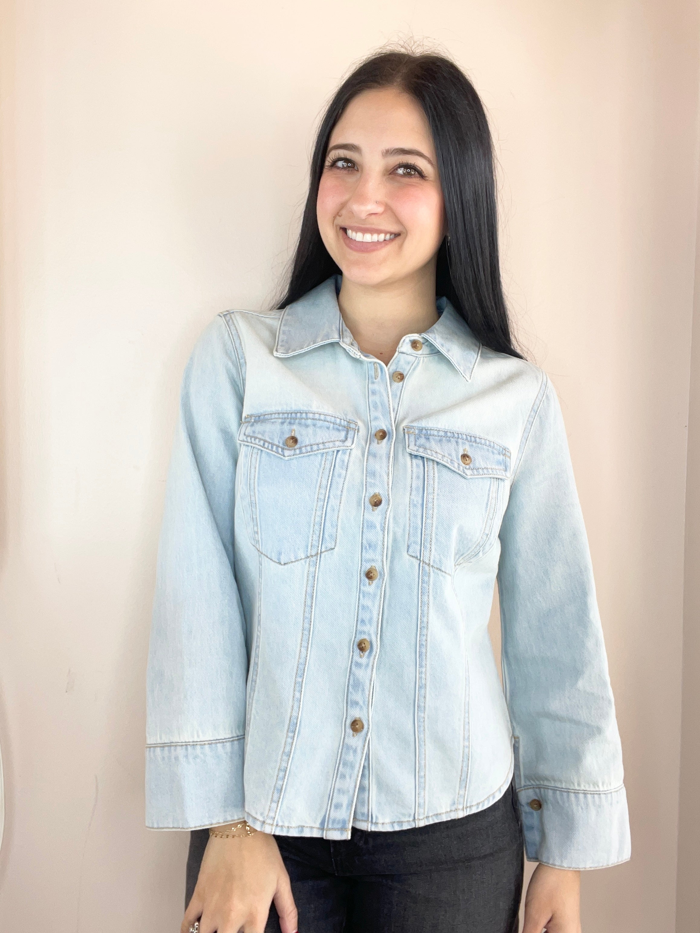 Lightweight denim button up shirt with functional buttons and pockets. True to size - Gianna is wearing the XS!