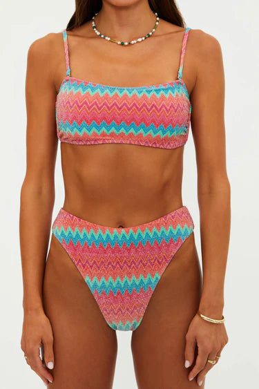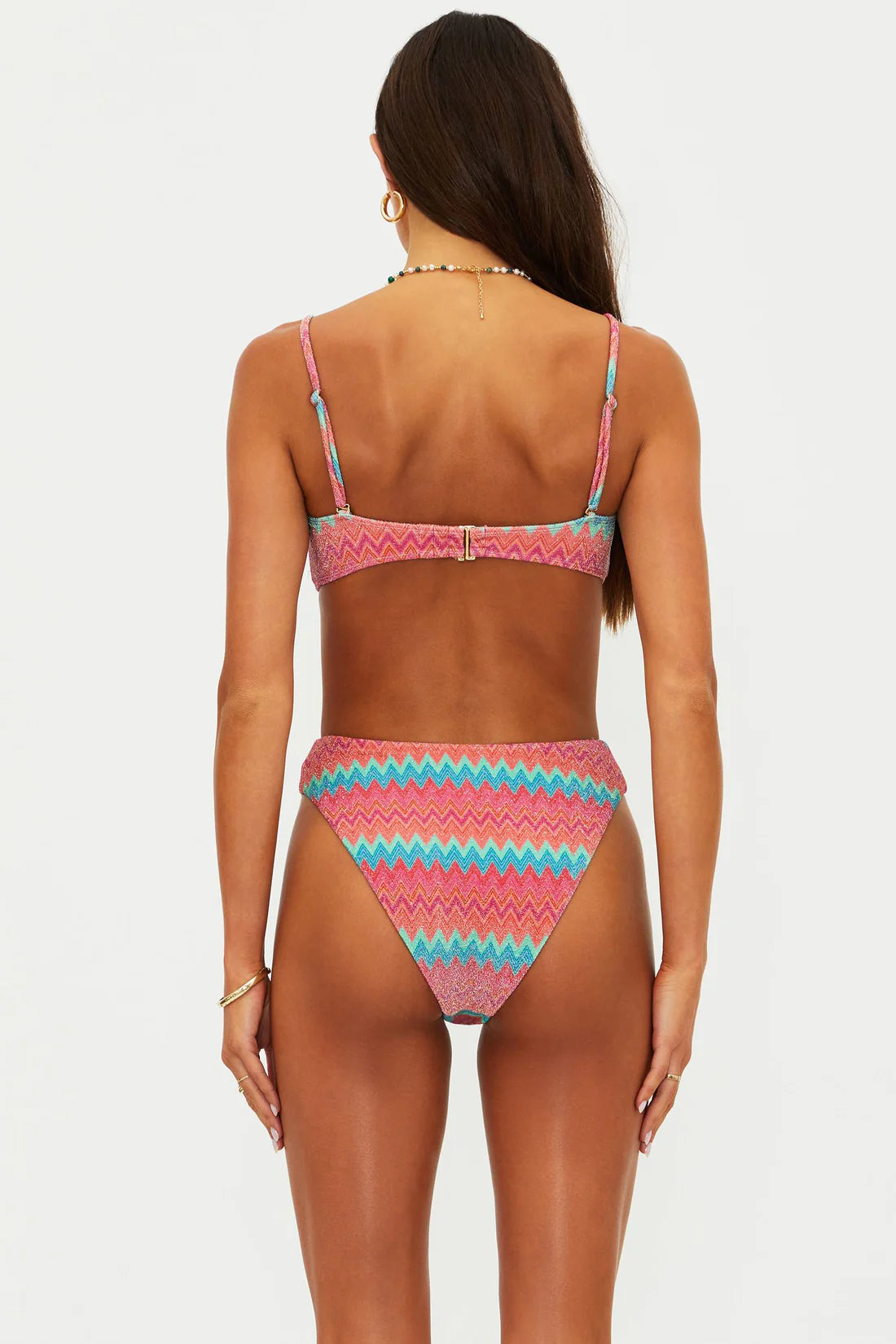 Multicolor lurex textured fabric with a chevron print and shimmer finish   Strapless bandeau silhouette   Removable soft cups Removable adjustable straps Straight neckline   Back clasp closure   Soft stretch knit fabric   Style Tip: Pair it with the matching Amarie Bottom and throw on a cover up for a beach to brunch moment. Add stacked gold cuffs for a polished poolside look. Model is wearing size small