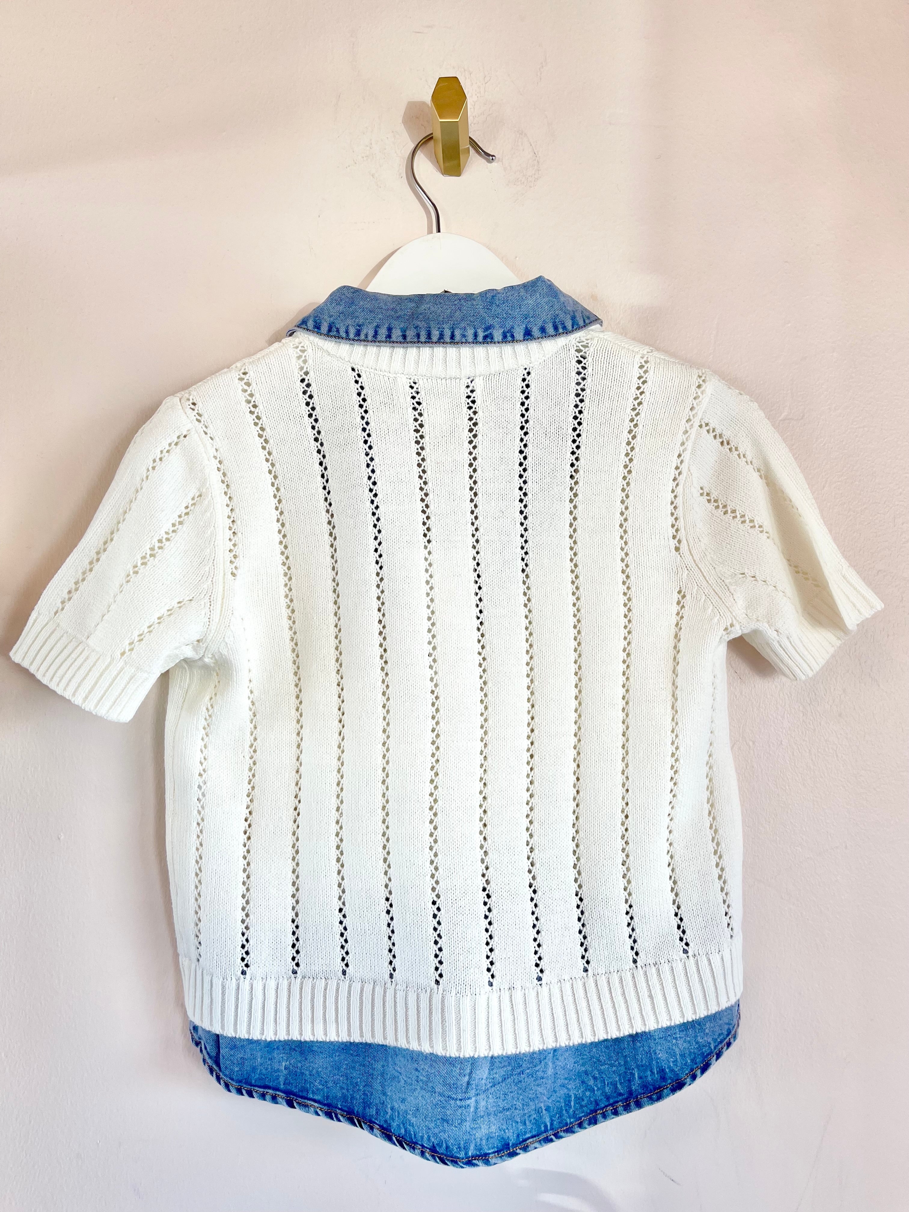 ivory knit v-neck pullover short sleeve with a built in denim collar and hem trus to size