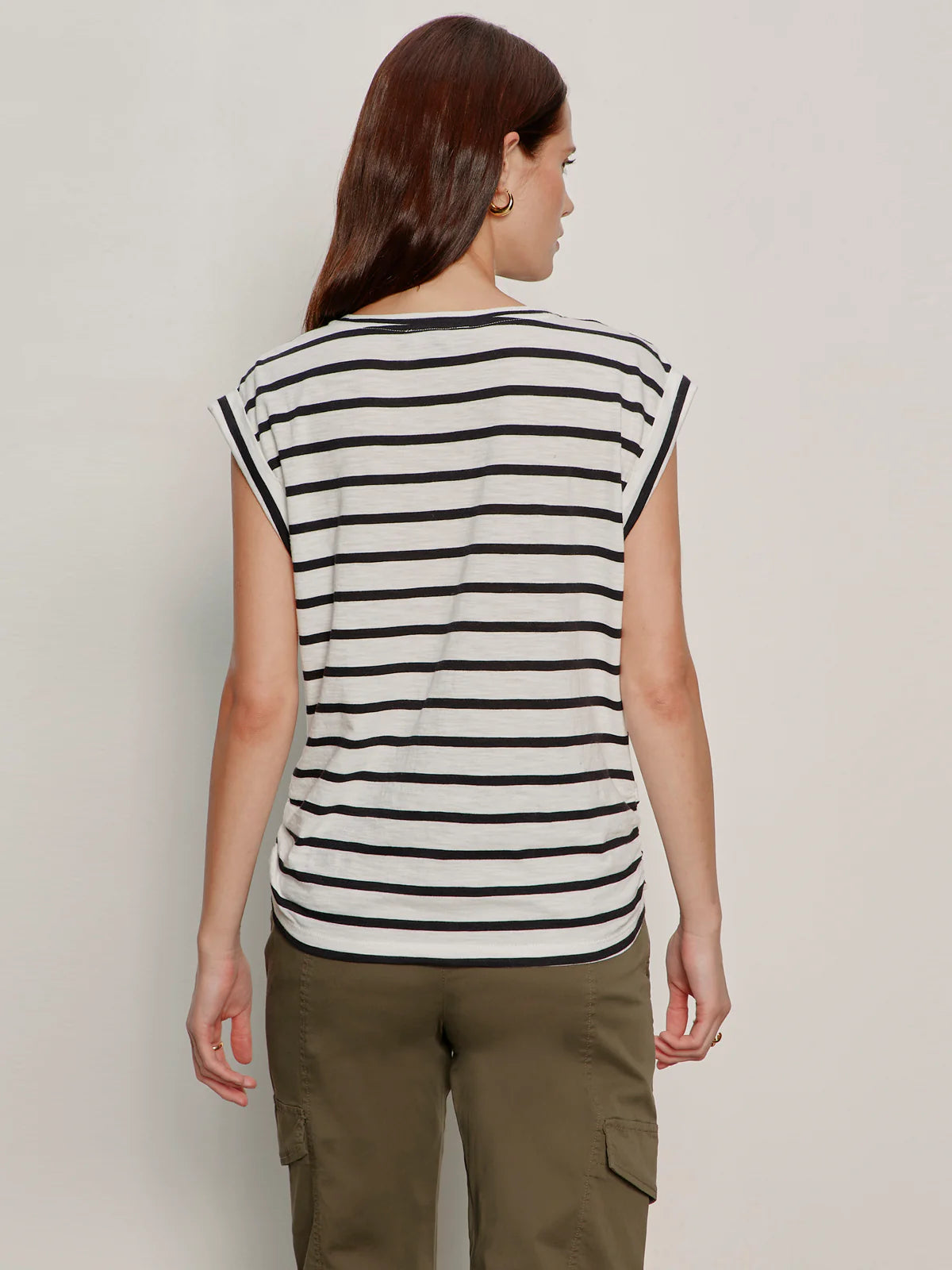 Cap Sleeve Crewneck Tee Rolled Sleeves Knotted Front Detail Relaxed Fit Model is 5'8" and wearing a size S. Front Length: 21 1/2" Bust: 38" 51% Cotton 49% Rayon     Cotton Slub Jersey - Solid     Machine Wash Cold, Lay Flat To Dry Imported