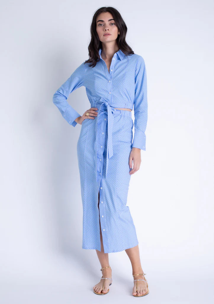 The Lila Top French Stripe by Karina Grimaldi radiates chic quirkiness. With a cropped cut, long sleeves, and a button front, this top effortlessly combines style and comfort. The collar adds a touch of sophistication, while the cinched waist and ties accentuate your figure. A must-have addition to your wardrobe