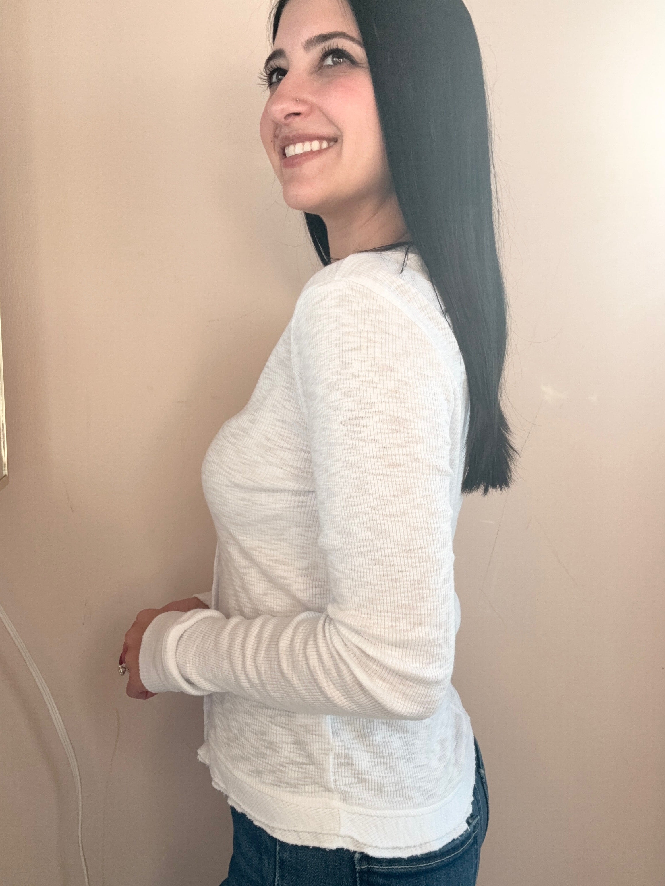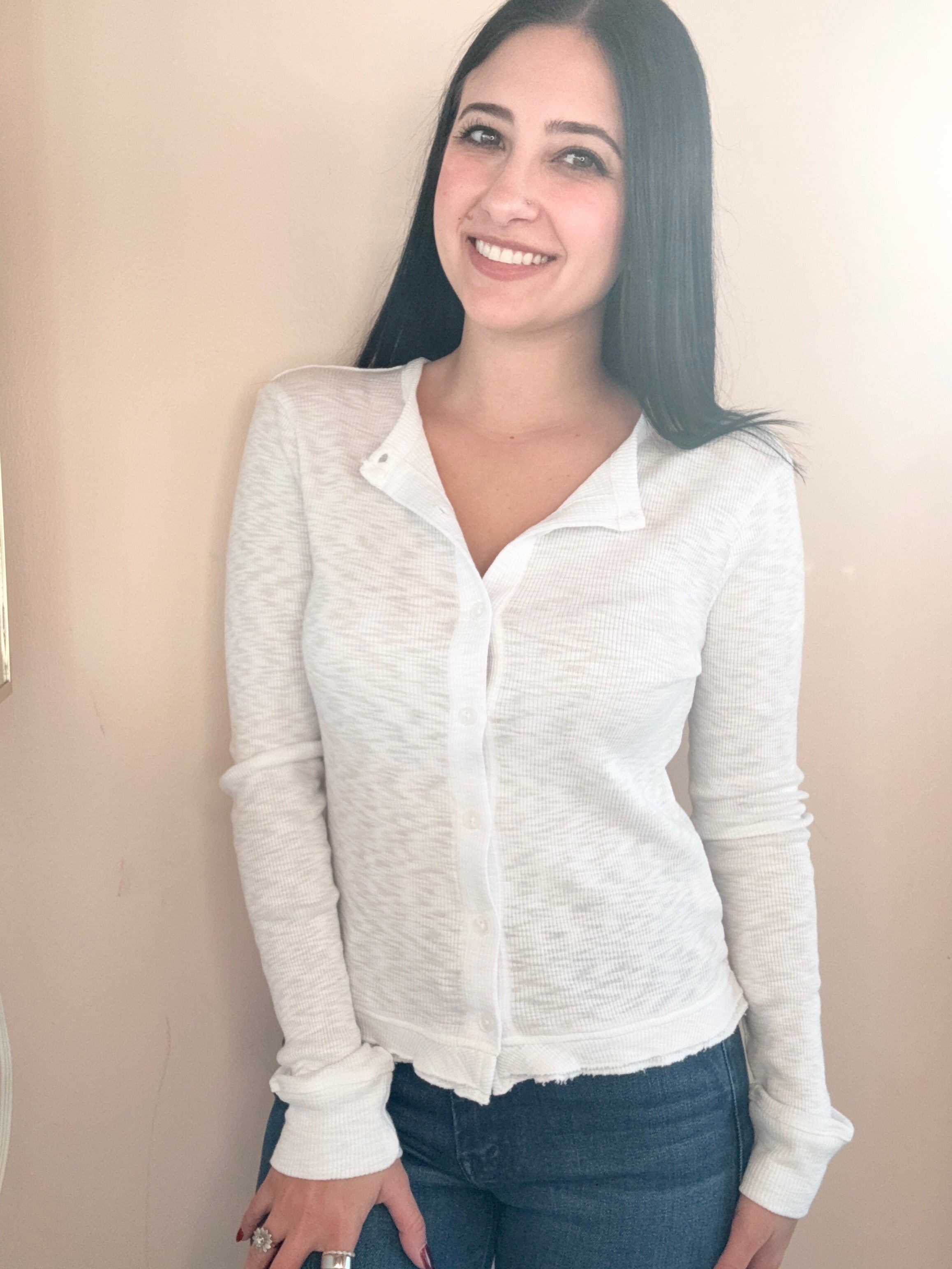 White long sleeve heather white top with buttons going down the front. Cute ruffle detail at the bottom. True to size.