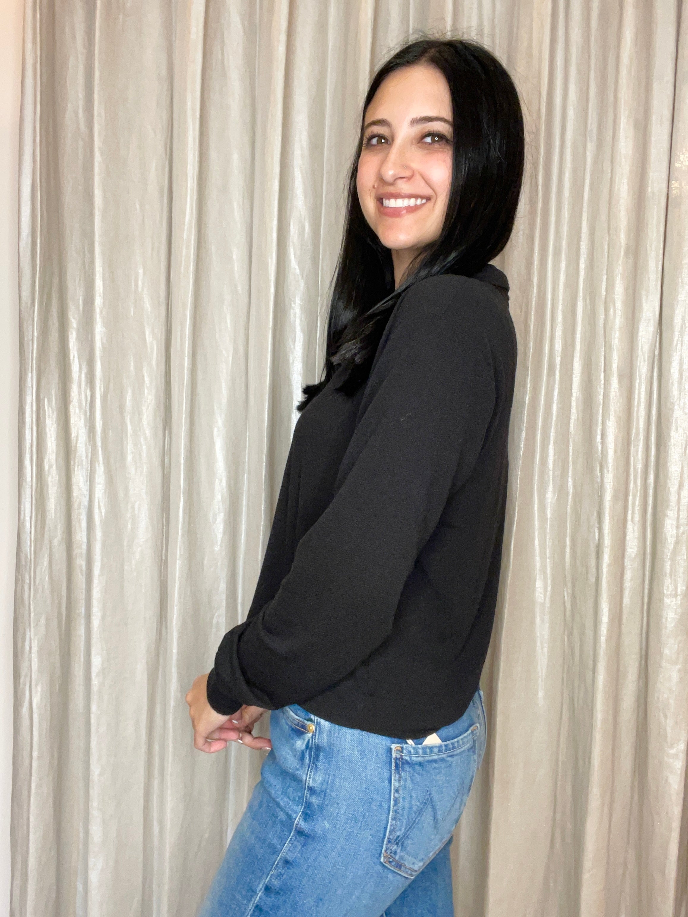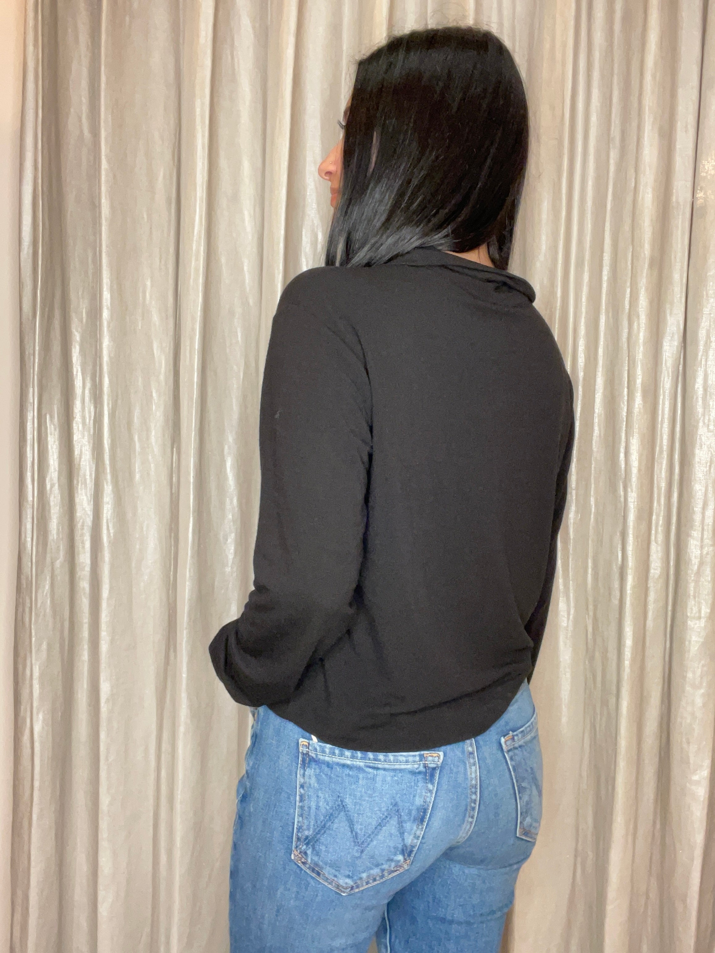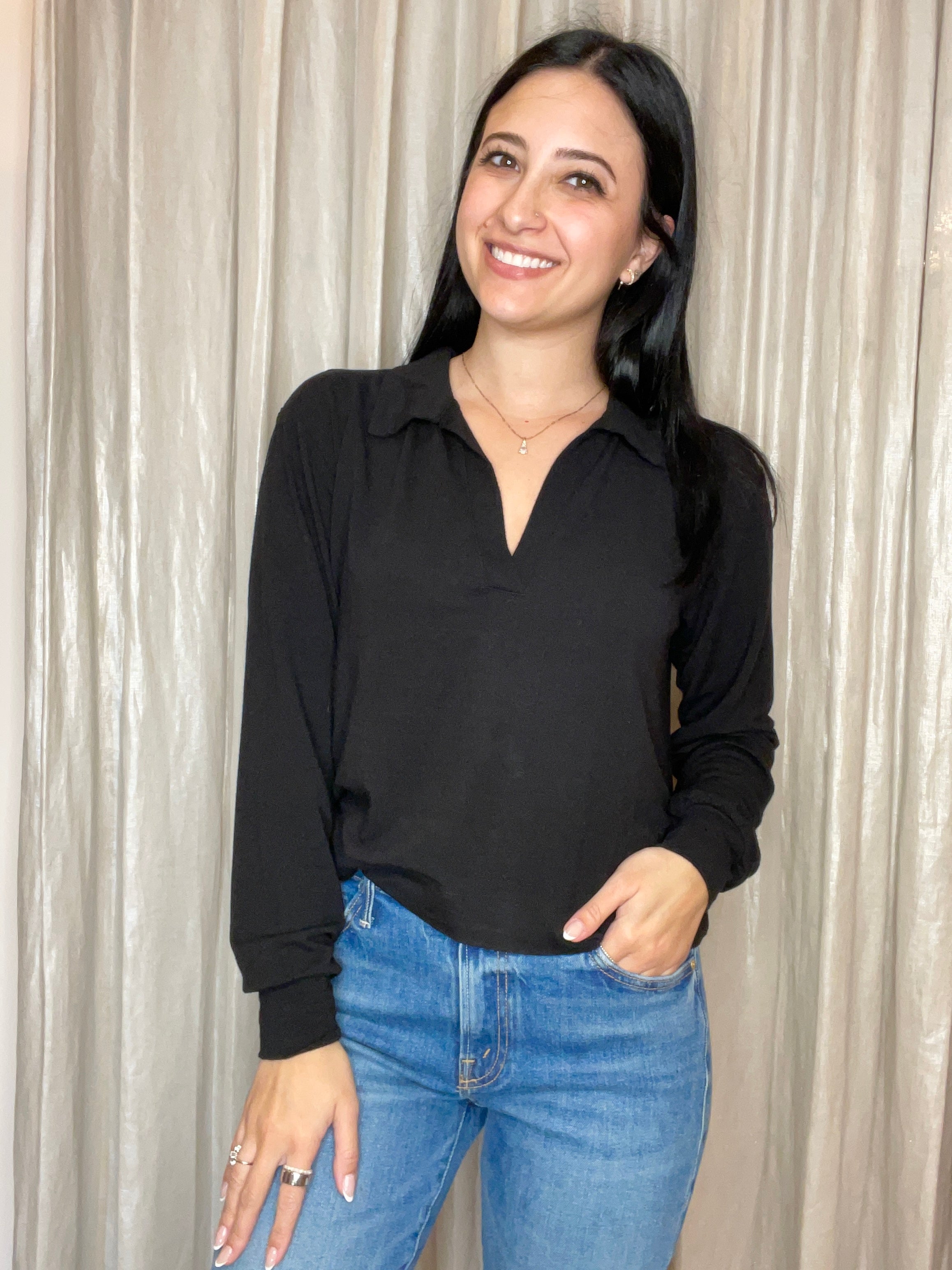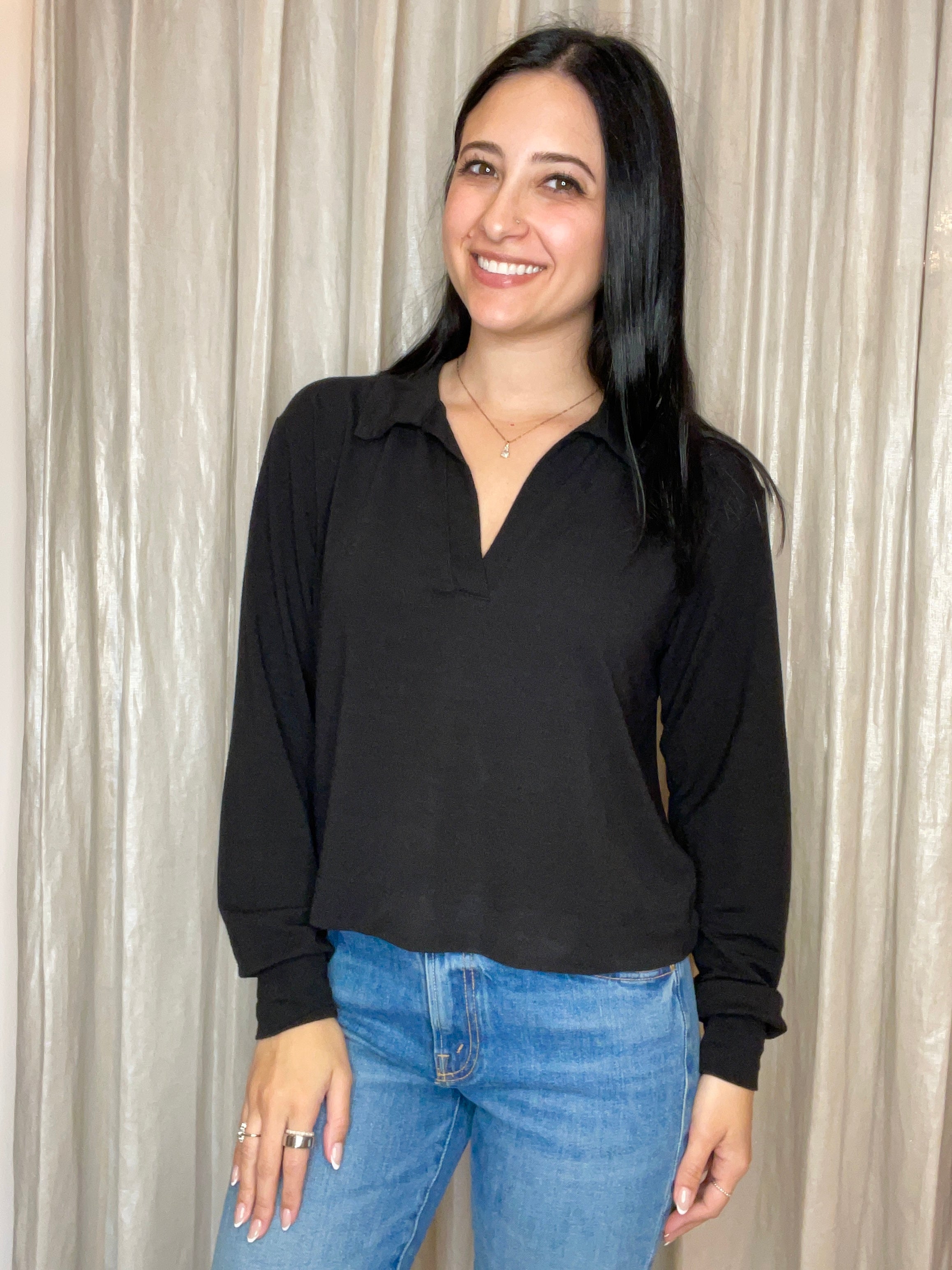 Lightweight black collared tee, runs cropped and boxy. True to size.