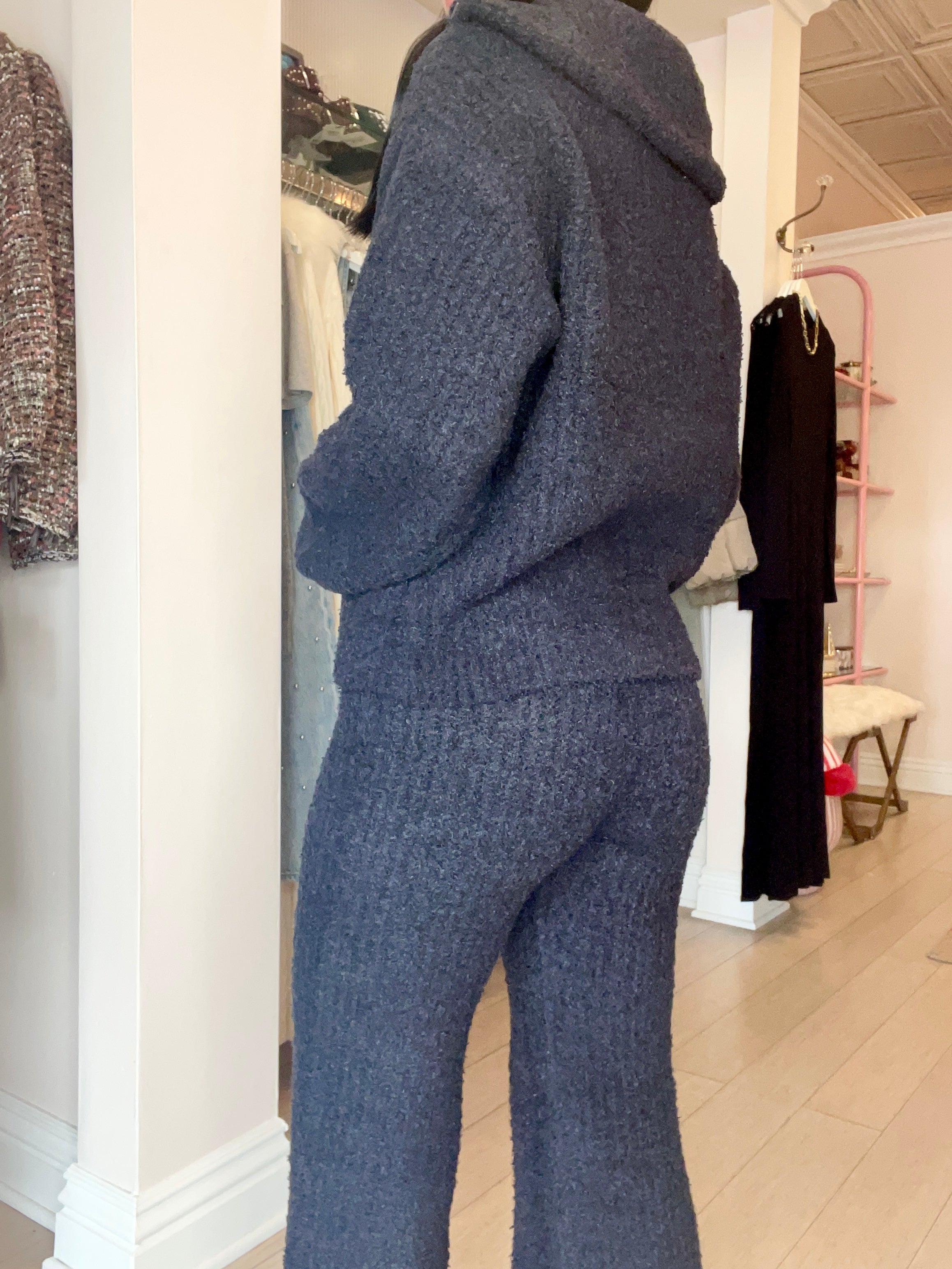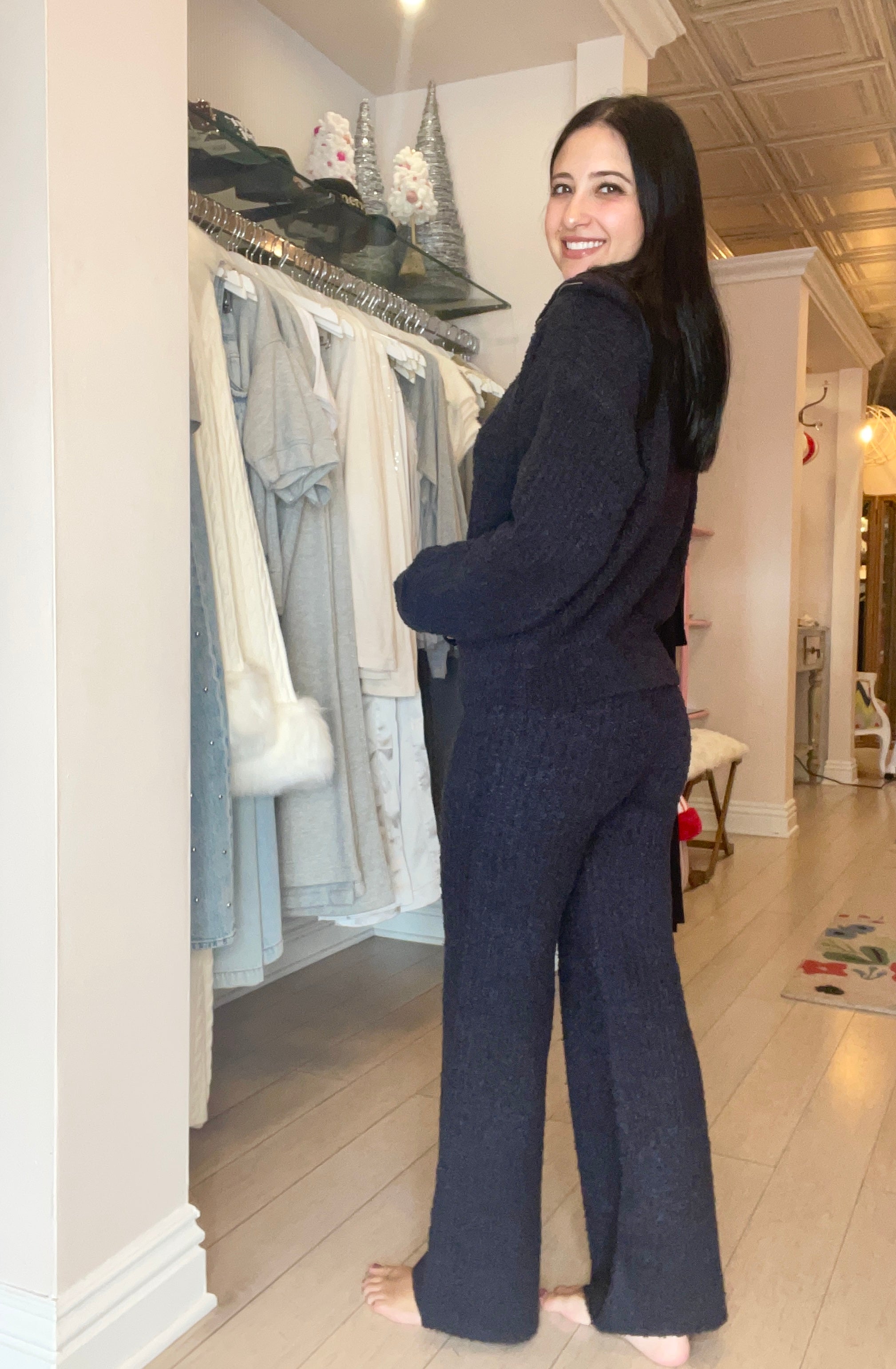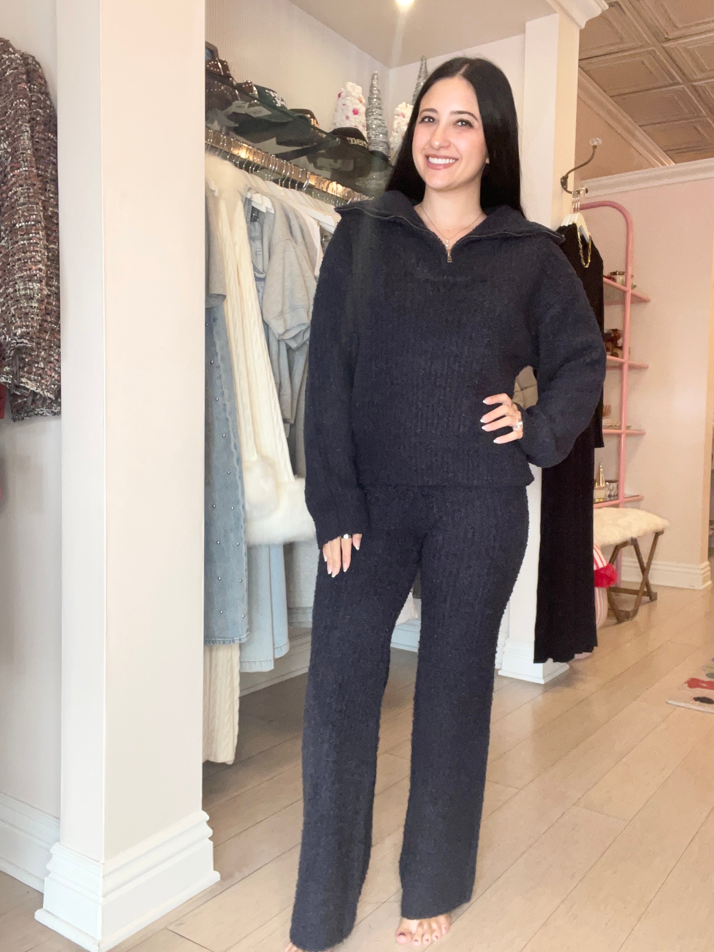 A graceful balance of cozy and chic, Mandie is one you won’t want to take off. Pair with our matching Sylvia sweater pant for the perfect duo. Fabric Content: 100% Polyester Imported Style: S3382-BLK