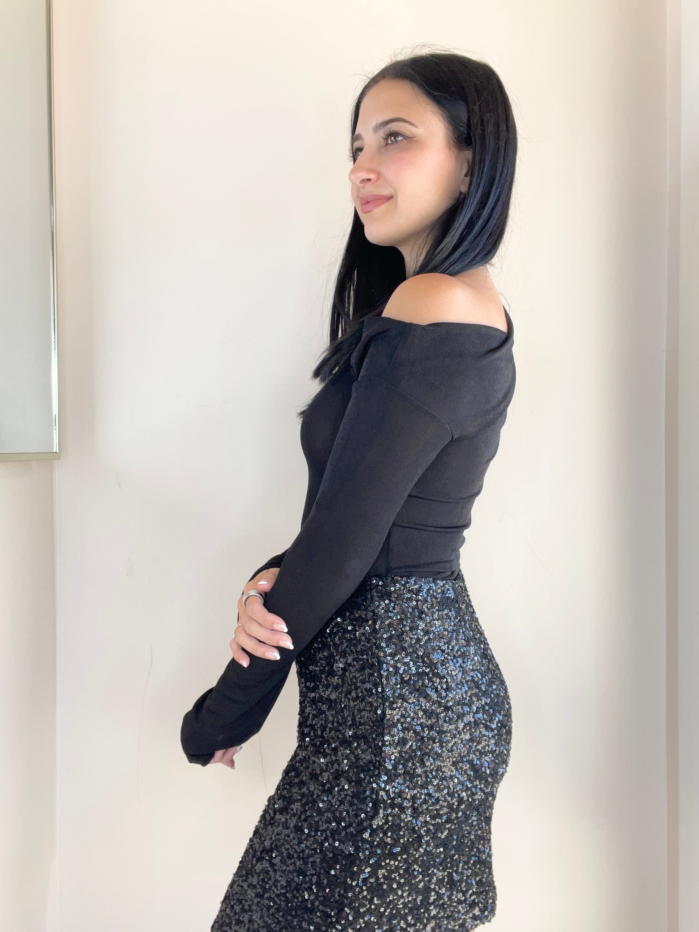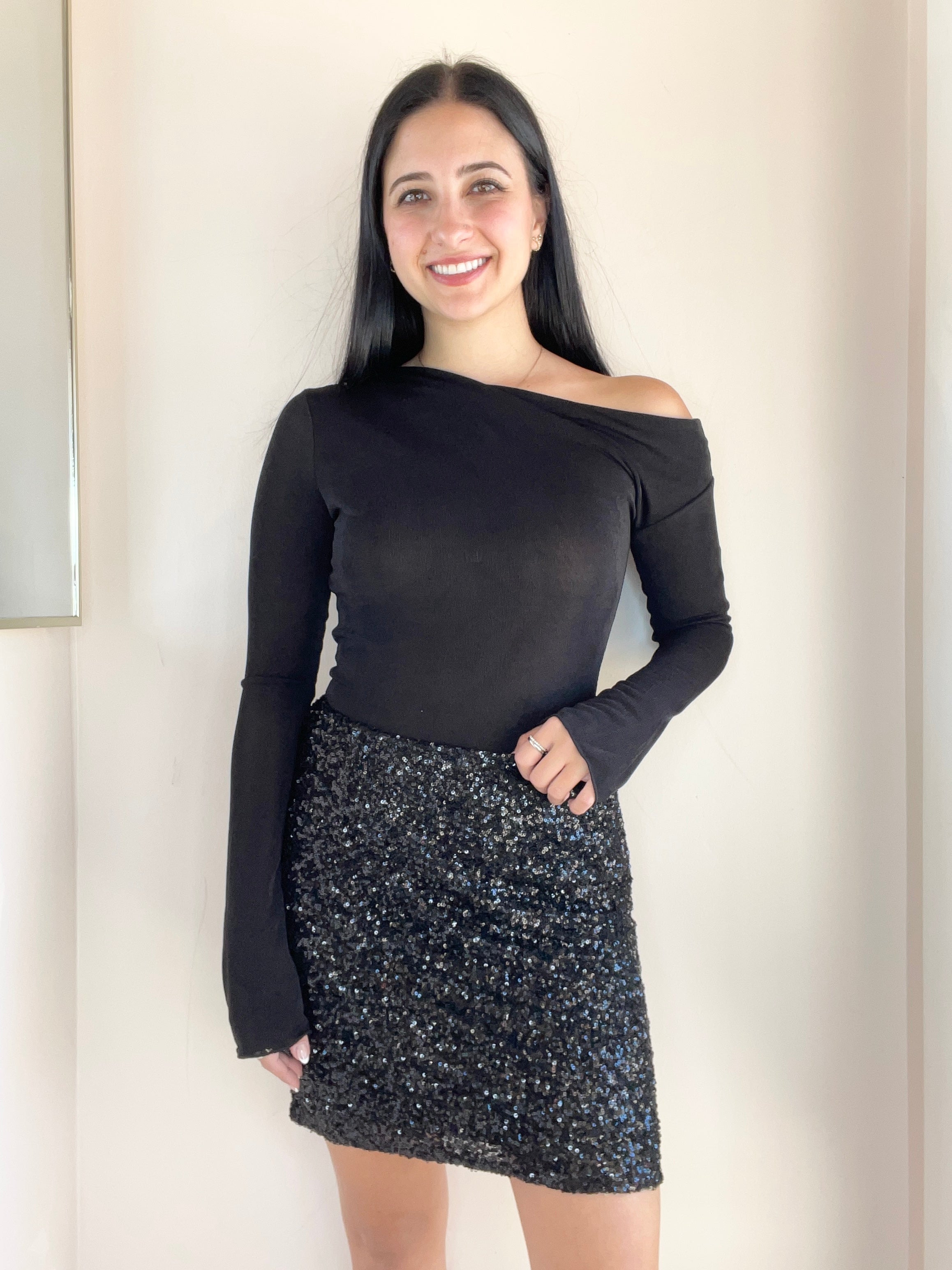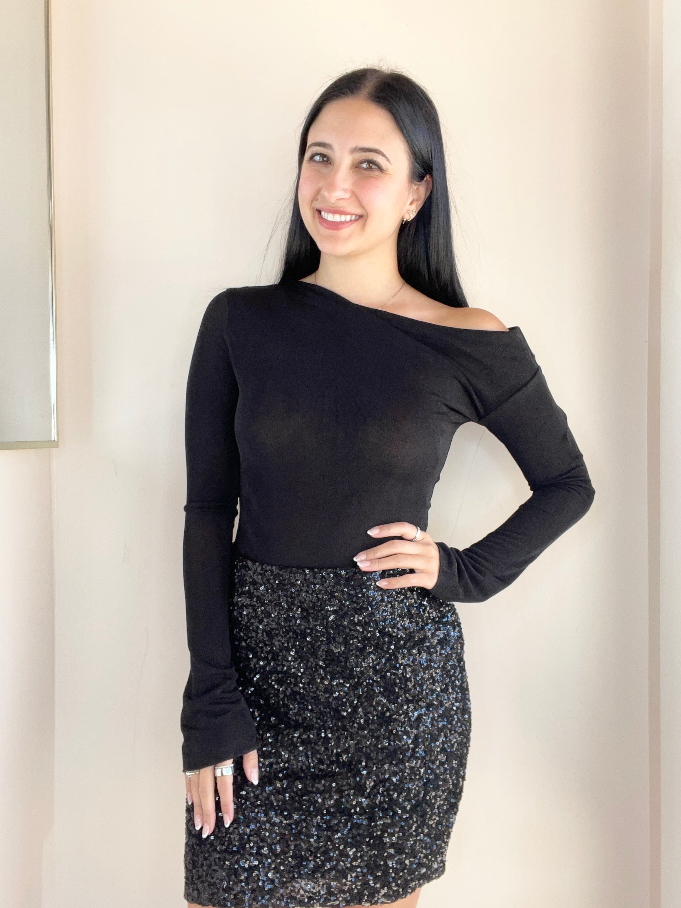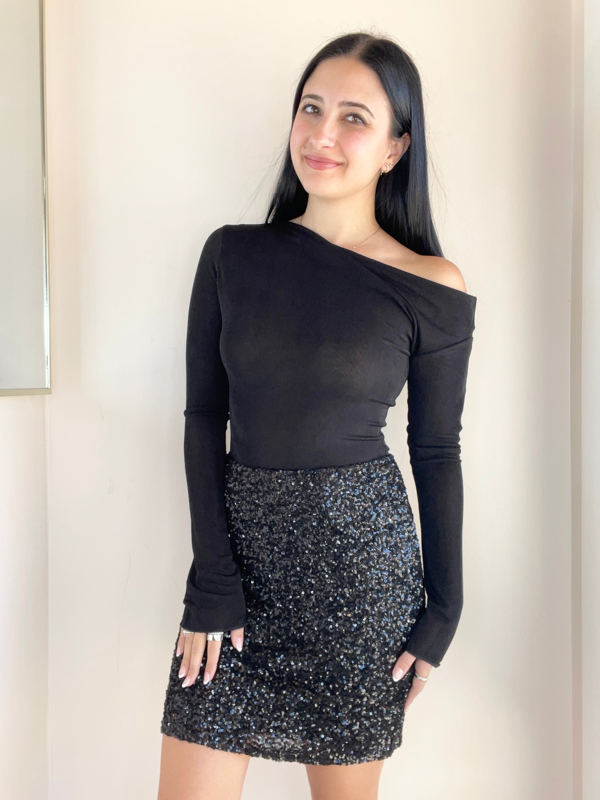 Black mesh asymmetrical top. Gianna is wearing the extra small; This style runs big. Pair with this fun sequin skirt, or with your favorite pair of jeans!