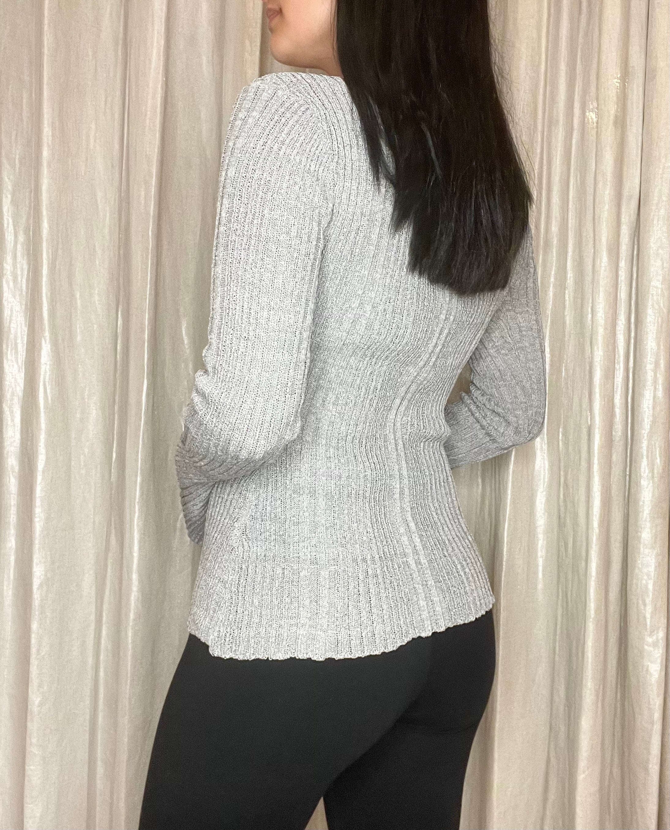 Grey knit top featuring flare sleeves, and two non-functional buttons in the front. pair with your favorite blue or black denim. True to size.