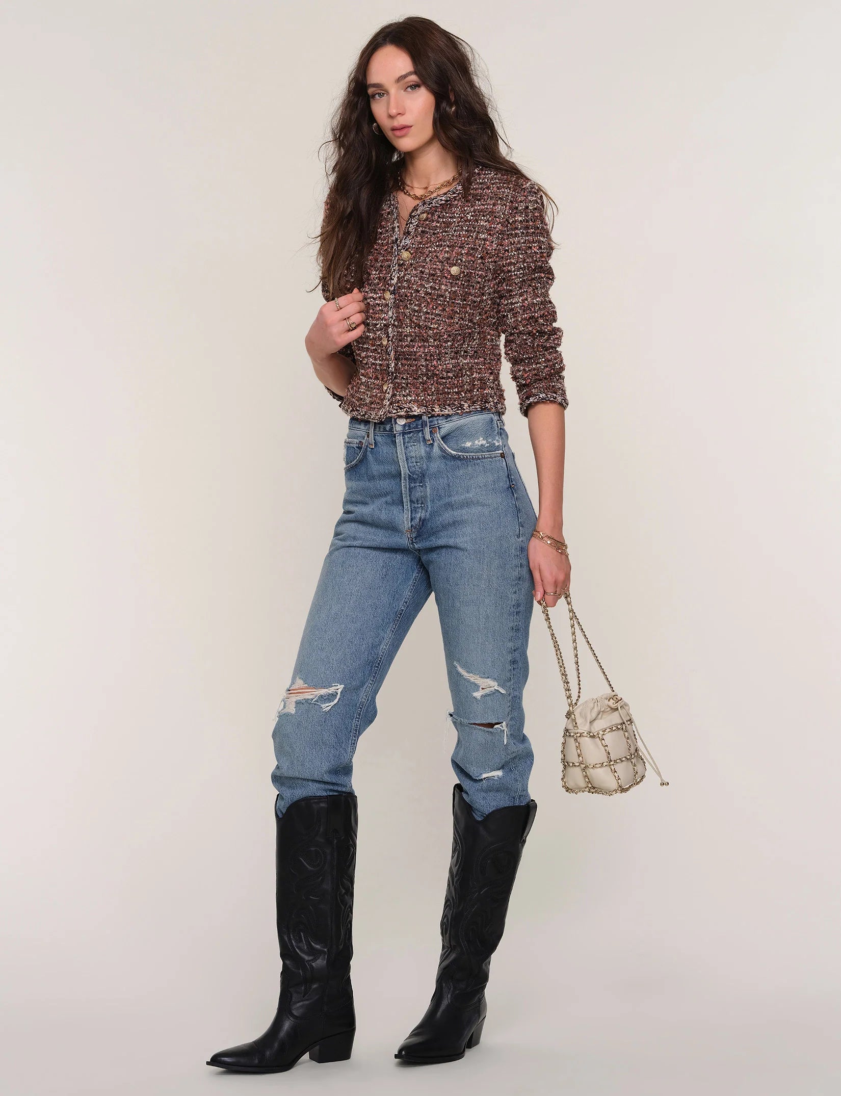Meet our Marzia Blazer, the perfect crew-neck blazer in a fun, textured tweed. It features novelty buttons, a textured trim and a slim fit. We love to pair it with straight leg jeans for a relaxed, casual look.
