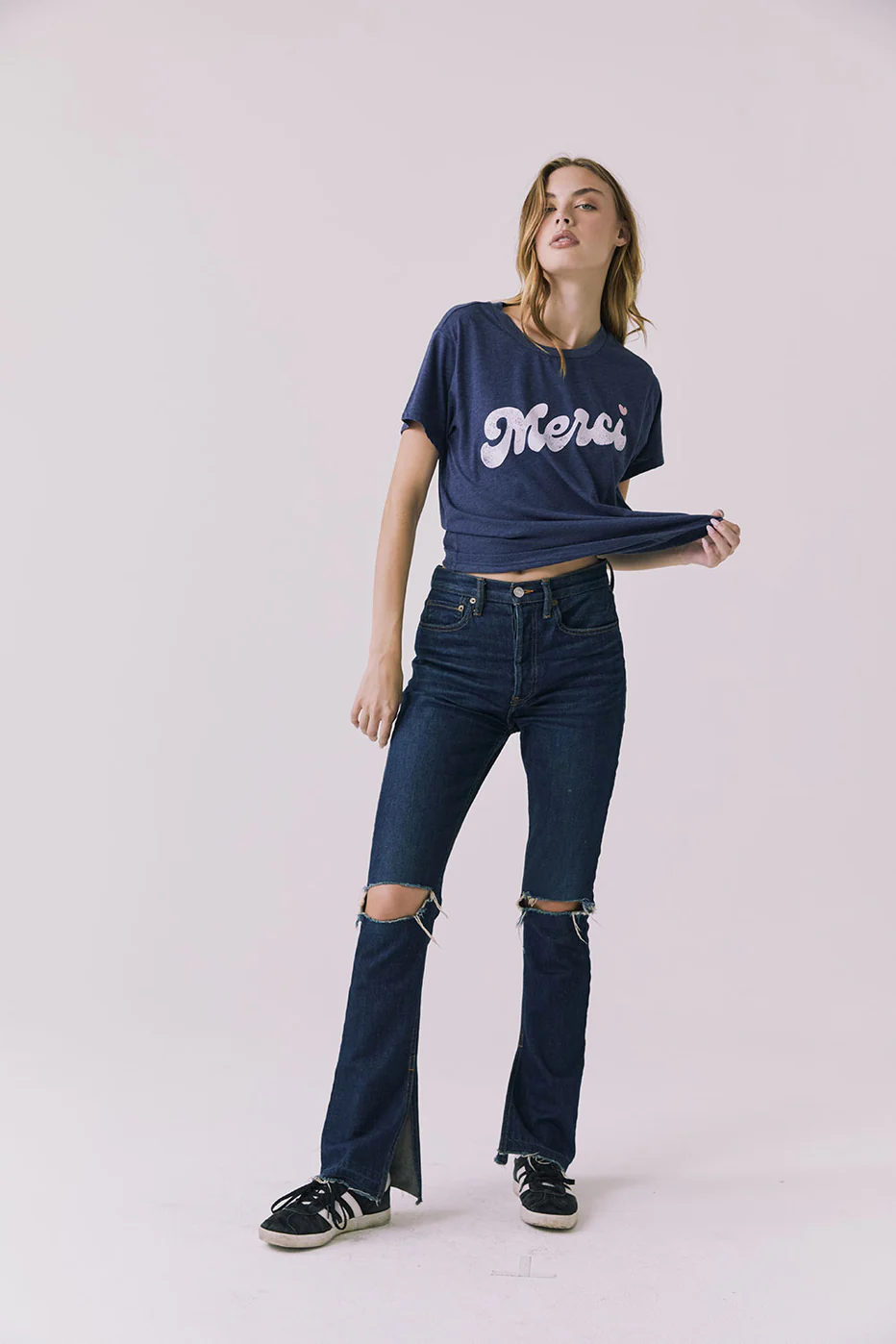Rendered in a sophisticated sapphire hue, the Merci Heart tee transcends casual basics with its refined color palette and thoughtful design.
