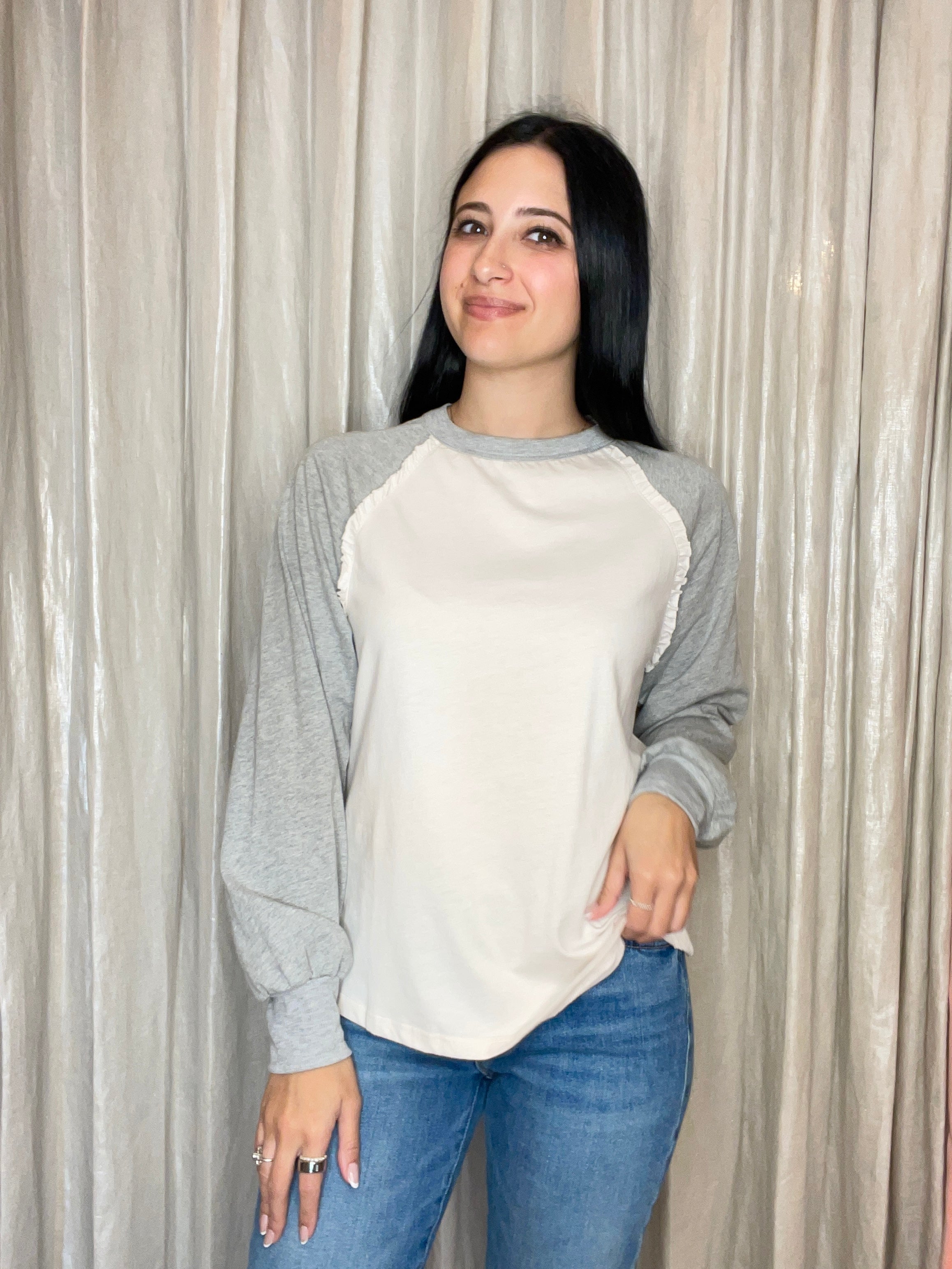 contrast long sleeve tee with mini ruffles on seams true to size / relaxed fit