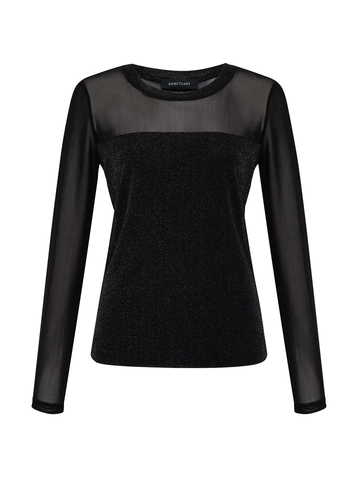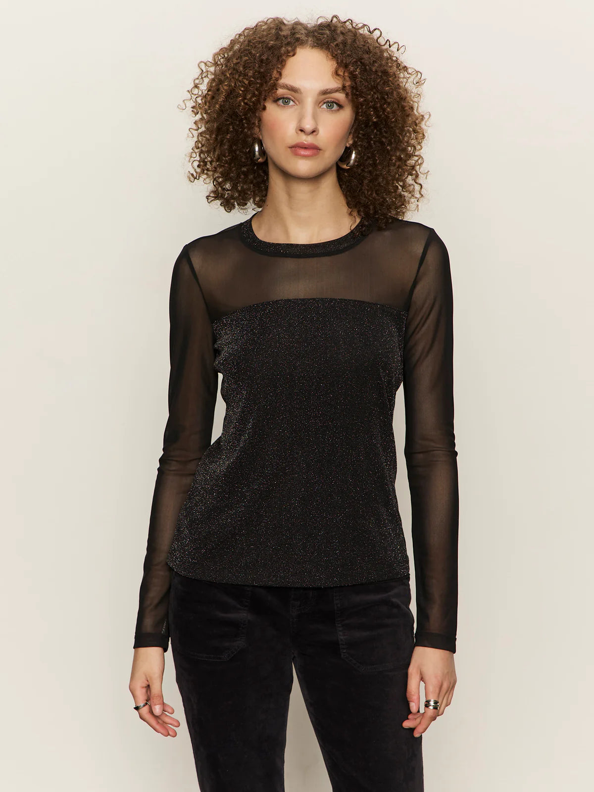 Long Sleeve Mesh Top Sparkle Bodice Crew Neck Pull-On Lightweight Fitted Model is 5'9 wearing size S. Front: 23" Bust: 30" Sleeve: 31 1/2"