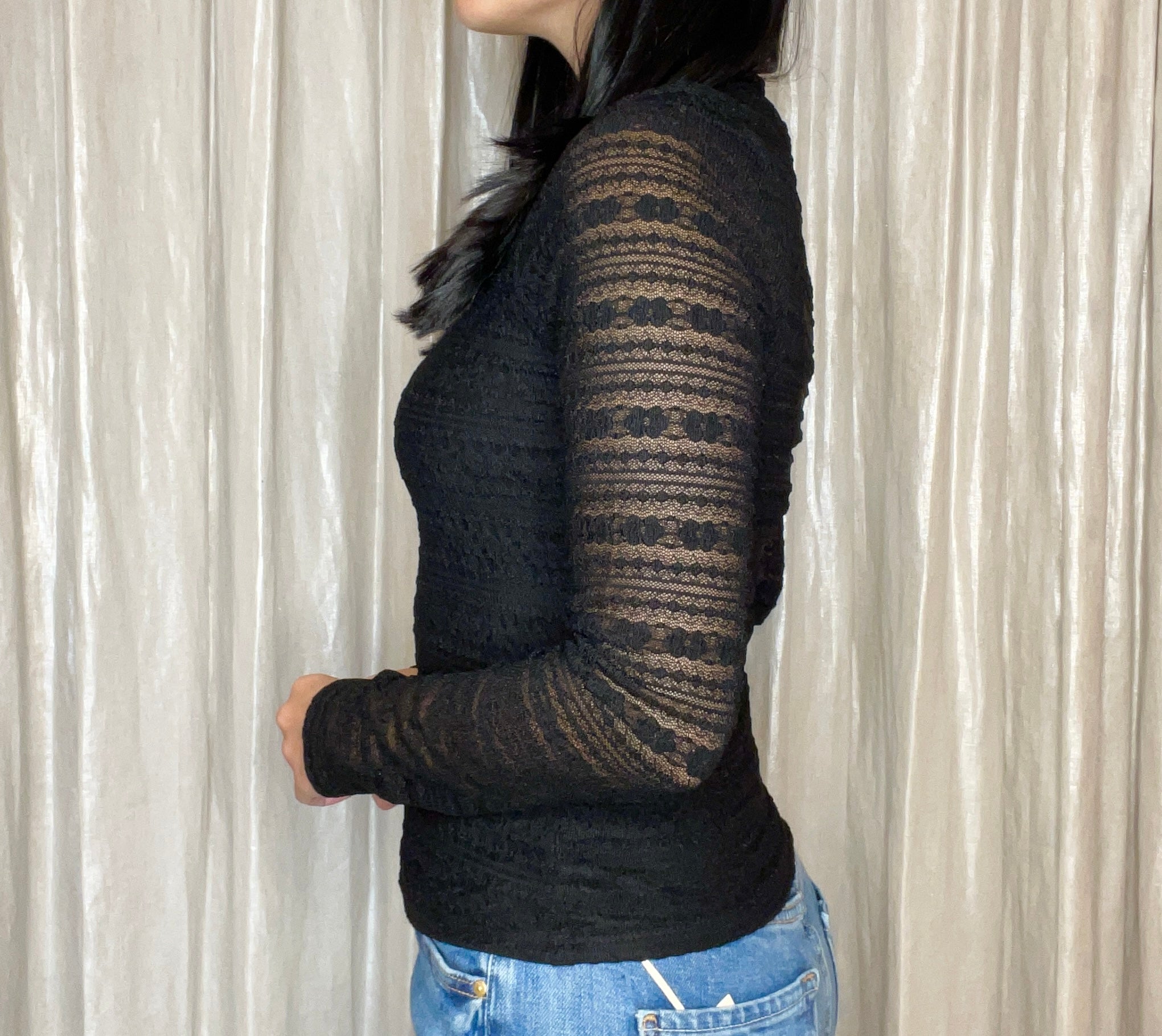 Black mesh/lace long sleeve; only the sleeves are see through! Pair with black or blue denim and an ankle bootie this Fall. True to size.