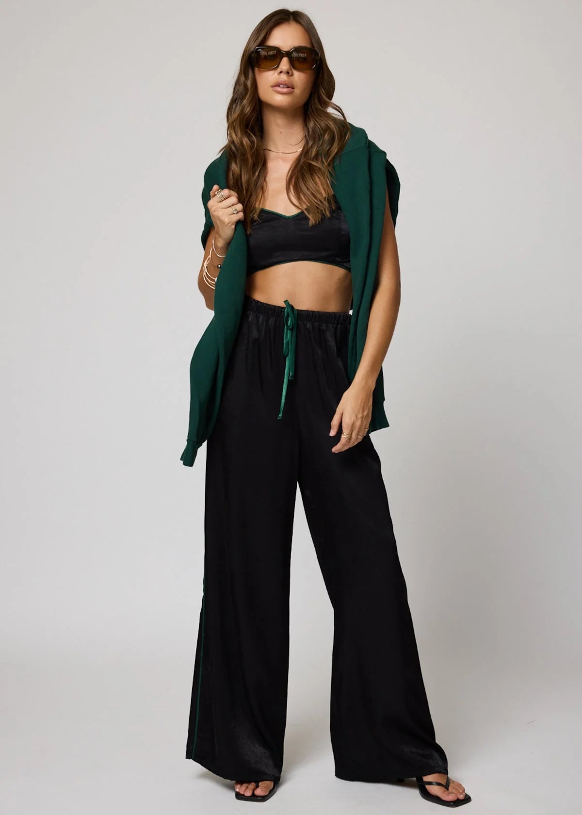 THE SILKY FABRICATION TURNS UP THE LUXURY WITH CONTRAST HUNTER GREEN PIPING AND DRAWSTRING. THE PANTS ARE FOUNDATIONAL AND WORK BACK TO OUR BASICS BUT DONT SKIP THE TAYLOR OR THE FAVORITE SHIRT FOR A COMPLETE LOOK.