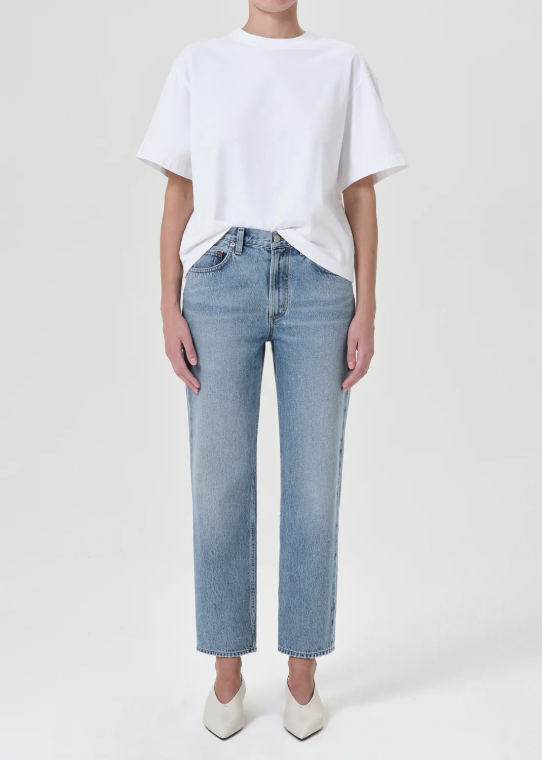 Mid-rise vintage straight with an ankle-grazing inseam, designed with a flattering square top block.
