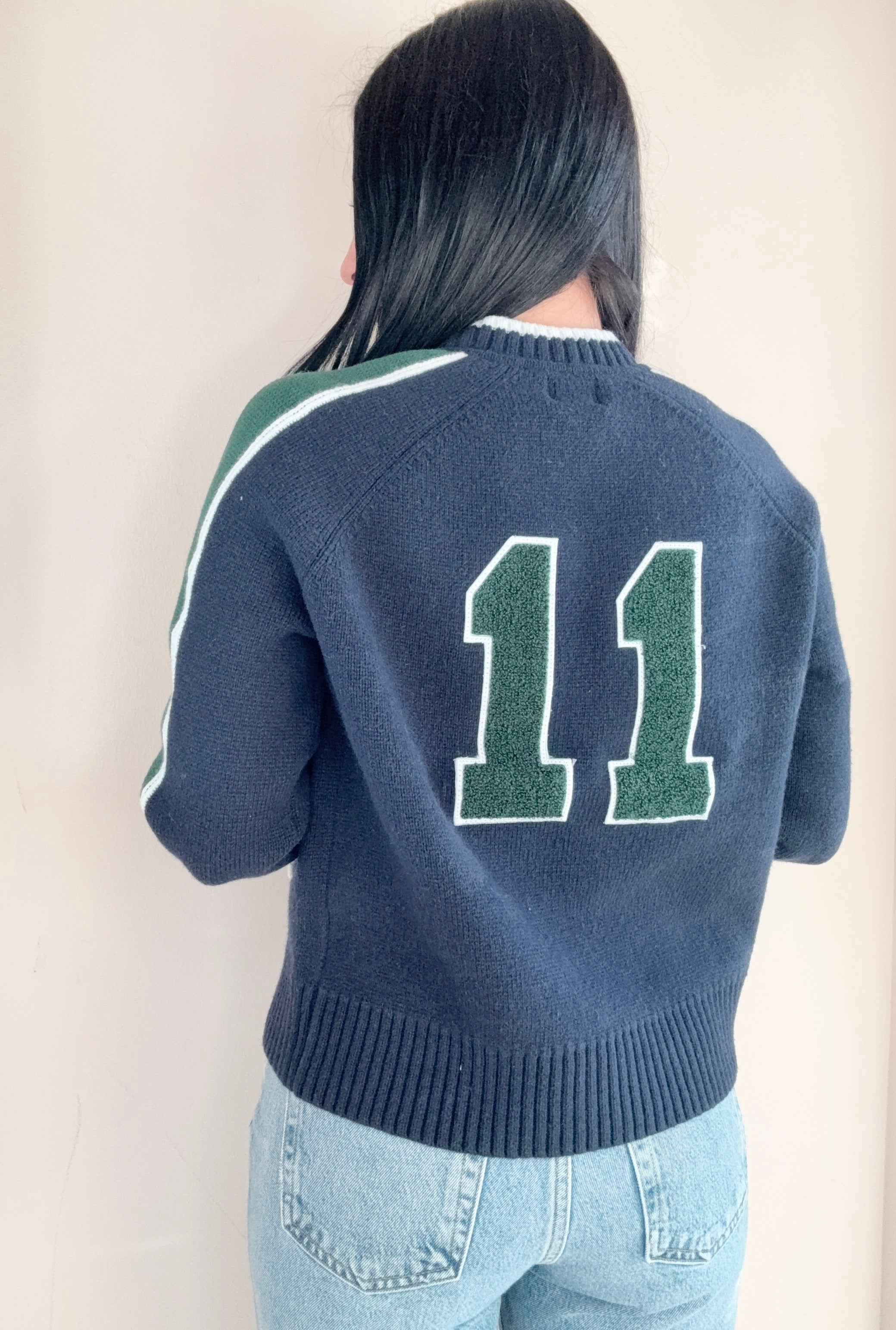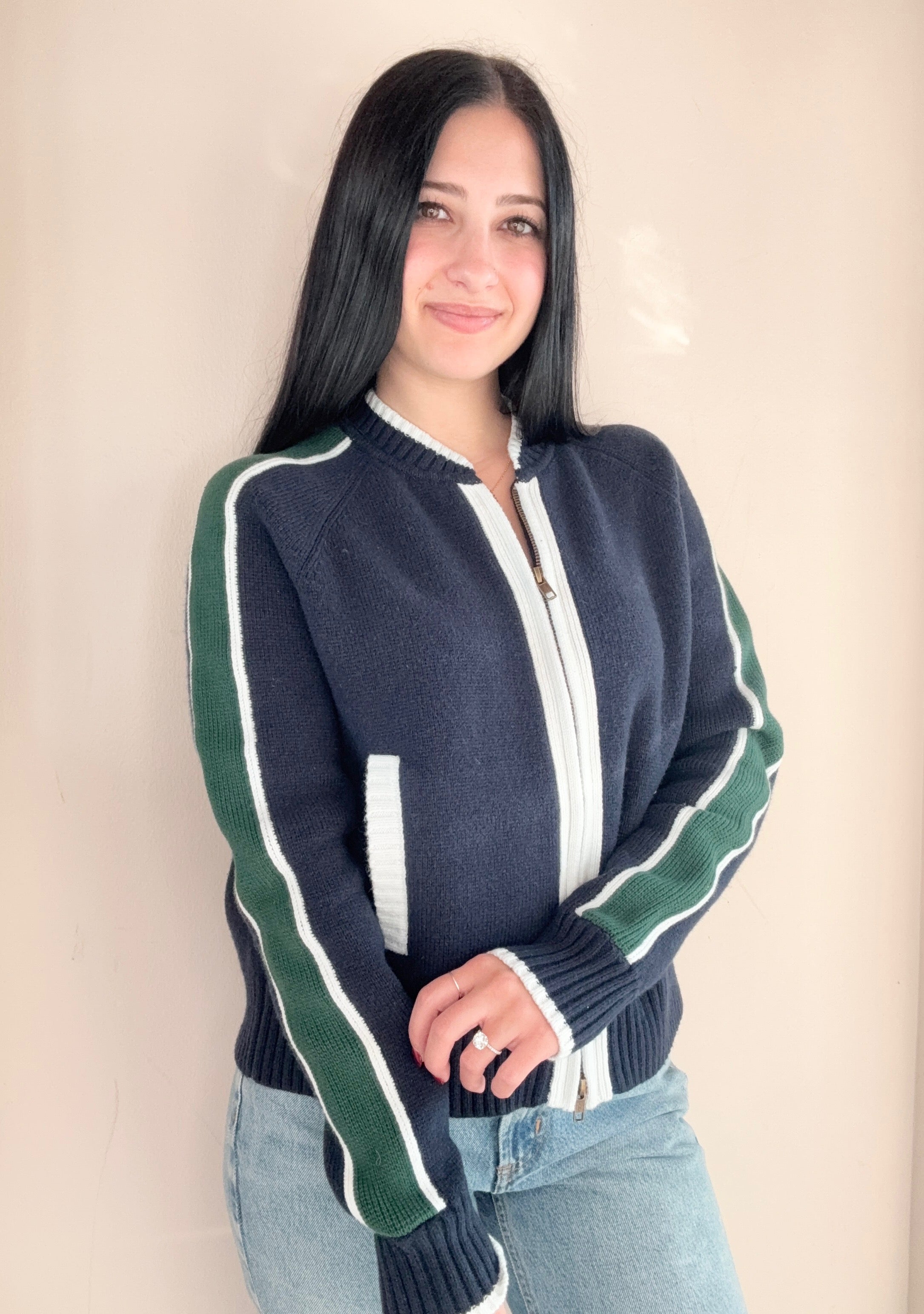 This navy jacket is thick and soft; perfect to throw on with jeans and a tee. It features pockets on the front, a two way zipper, and a green stripe down the arms.