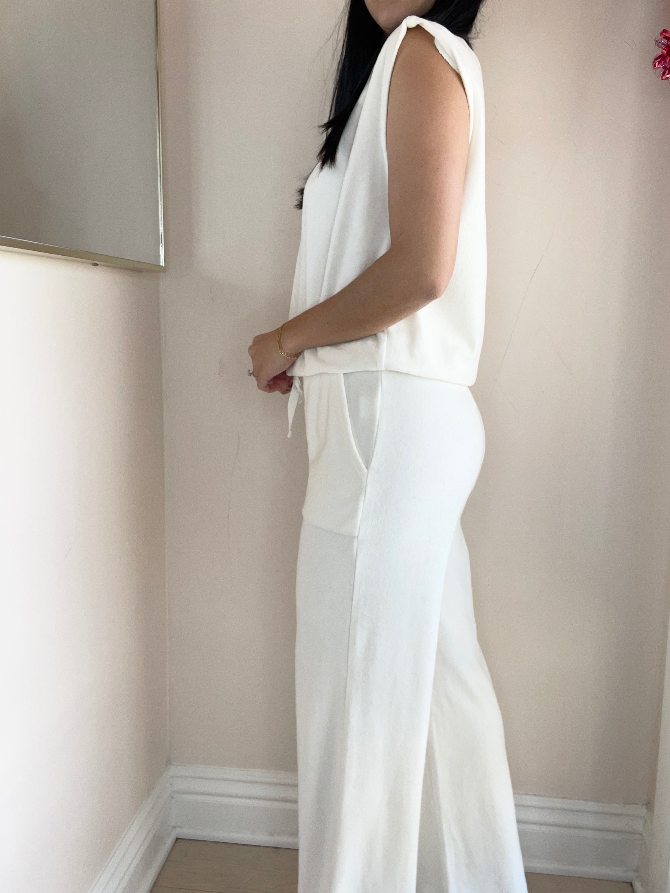 Super soft white lounge pant featuring a drawstring waist, and pockets in the front. Pair with the matching Split Neck Sleeveless Tee to complete the look! True to size.
